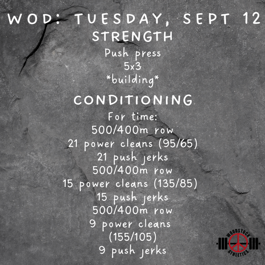 WOD & Barbell Club: Tuesday, September 12 Posted bySteph VermeychukSeptember 12, 2023September 10, 2023Posted inWorkout of the Day Share this: Click to share on X (Opens in new window) X Click to share on Facebook (Opens in new window) Facebook Like Loading... Related