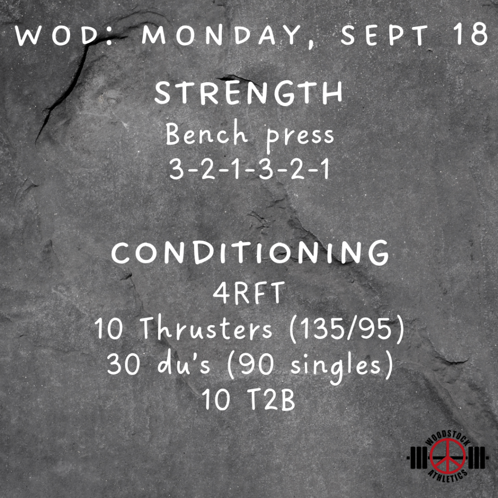 WOD: Monday, September 18 Posted bySteph VermeychukSeptember 18, 2023September 17, 2023Posted inWorkout of the Day Share this: Click to share on X (Opens in new window) X Click to share on Facebook (Opens in new window) Facebook Like Loading... Related