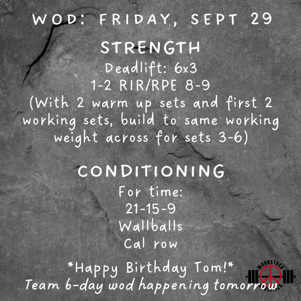 WOD: Friday, September 29 Posted bySteph VermeychukSeptember 29, 2023September 24, 2023Posted inWorkout of the Day Share this: Click to share on X (Opens in new window) X Click to share on Facebook (Opens in new window) Facebook Like Loading... Related