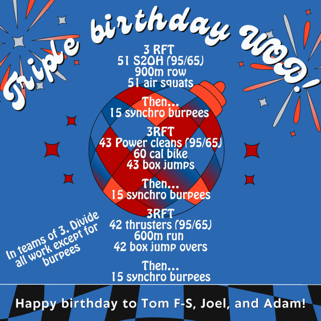Team Birthday WOD & Barbell Club: Saturday, September 30 Posted bySteph VermeychukSeptember 30, 2023September 24, 2023Posted inWorkout of the Day Share this: Click to share on X (Opens in new window) X Click to share on Facebook (Opens in new window) Facebook Like Loading... Related
