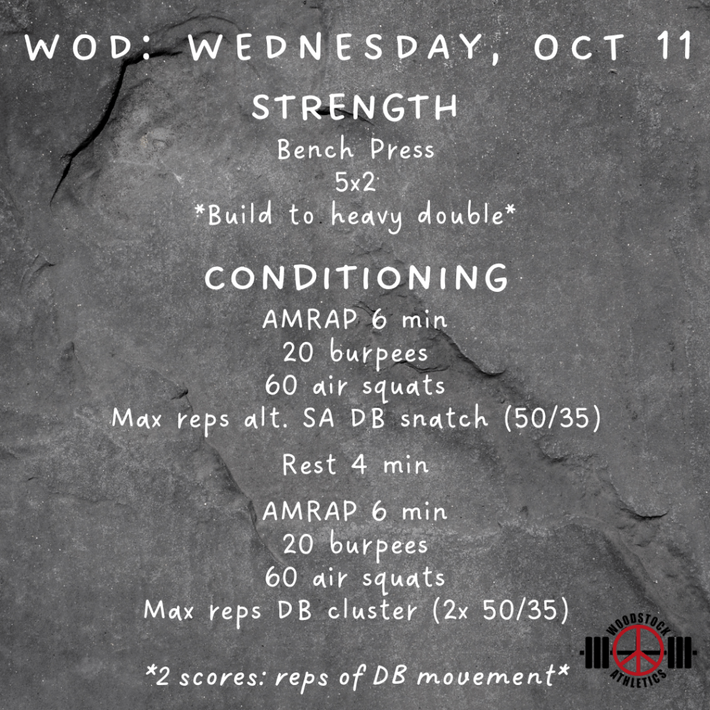 WOD: Wednesday, October 11 Posted bySteph VermeychukOctober 11, 2023October 8, 2023Posted inWorkout of the Day Share this: Click to share on X (Opens in new window) X Click to share on Facebook (Opens in new window) Facebook Like Loading... Related