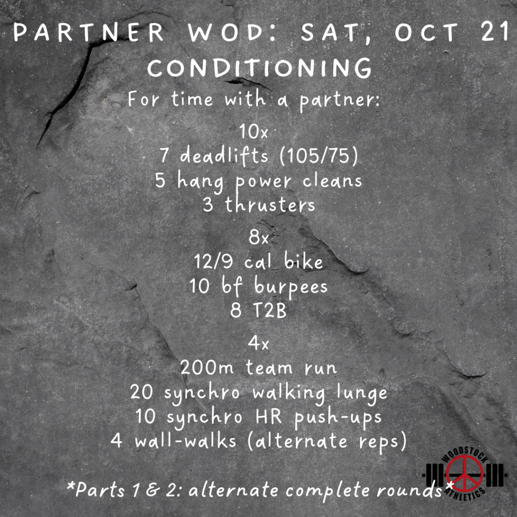 Partner WOD & Barbell Club: Saturday, October 21 Posted bySteph VermeychukOctober 21, 2023October 15, 2023Posted inWorkout of the Day Share this: Click to share on X (Opens in new window) X Click to share on Facebook (Opens in new window) Facebook Like Loading... Related