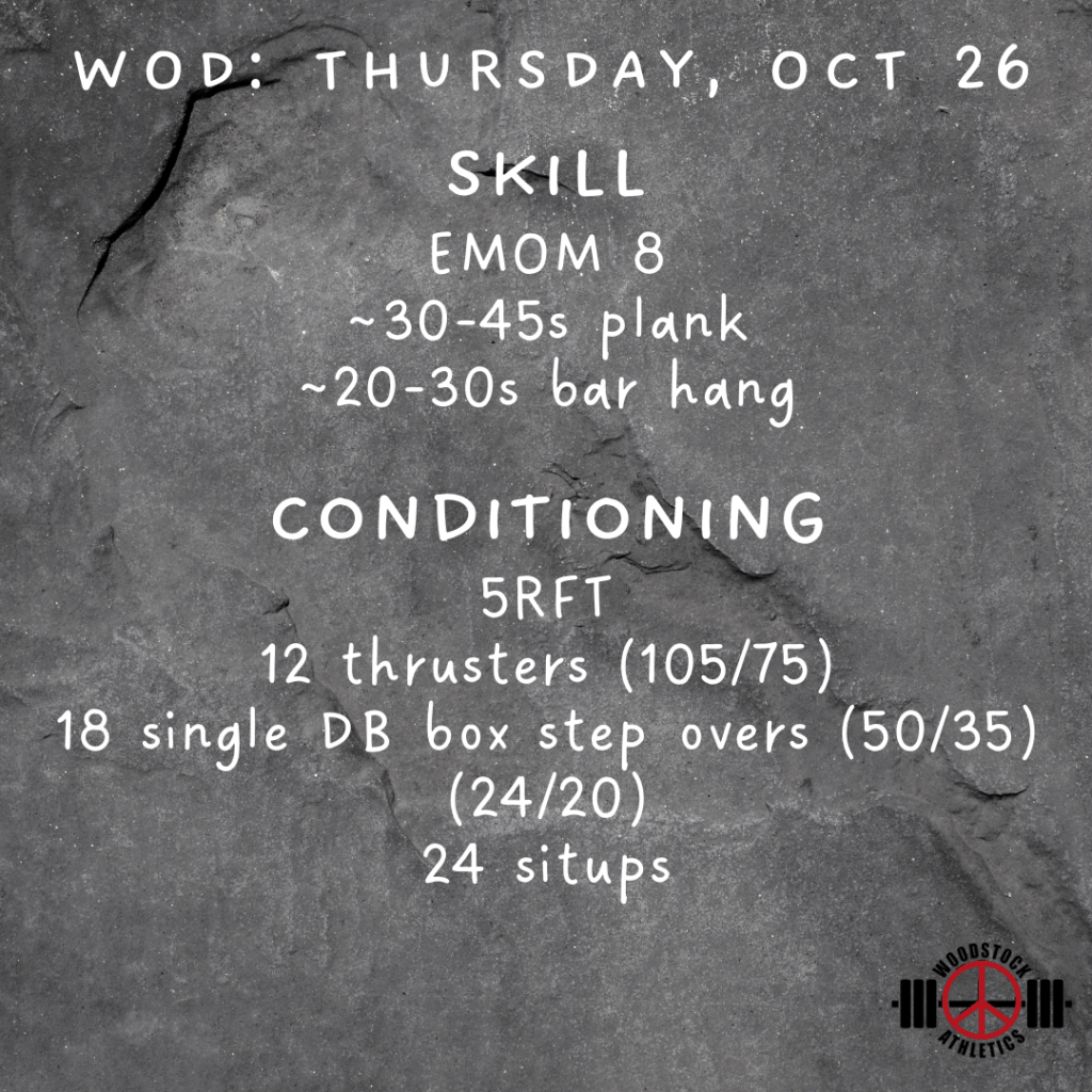WOD & Barbell Club: Thursday, October 26 Posted bySteph VermeychukOctober 26, 2023October 22, 2023Posted inWorkout of the Day Share this: Click to share on X (Opens in new window) X Click to share on Facebook (Opens in new window) Facebook Like Loading... Related