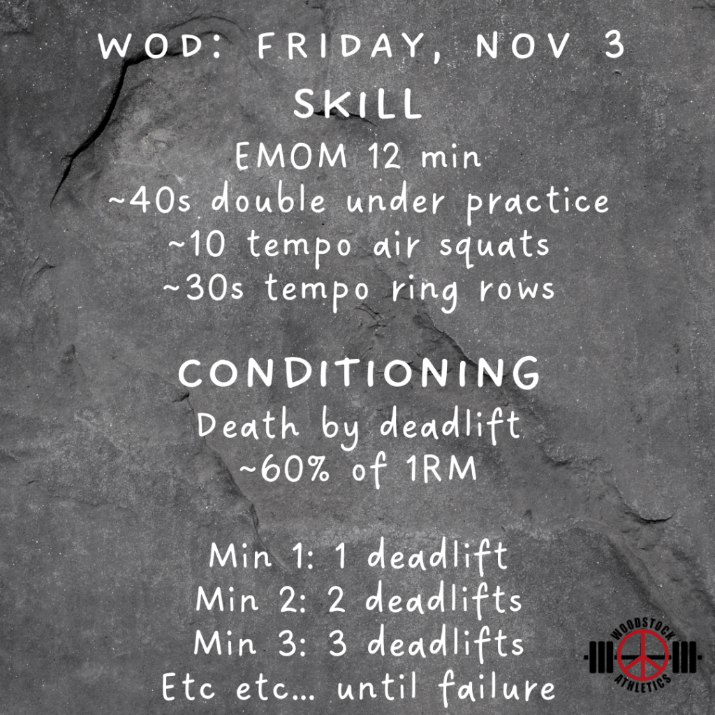 WOD: Friday, November 3 Posted bySteph VermeychukNovember 3, 2023October 29, 2023Posted inWorkout of the Day Share this: Click to share on X (Opens in new window) X Click to share on Facebook (Opens in new window) Facebook Like Loading... Related