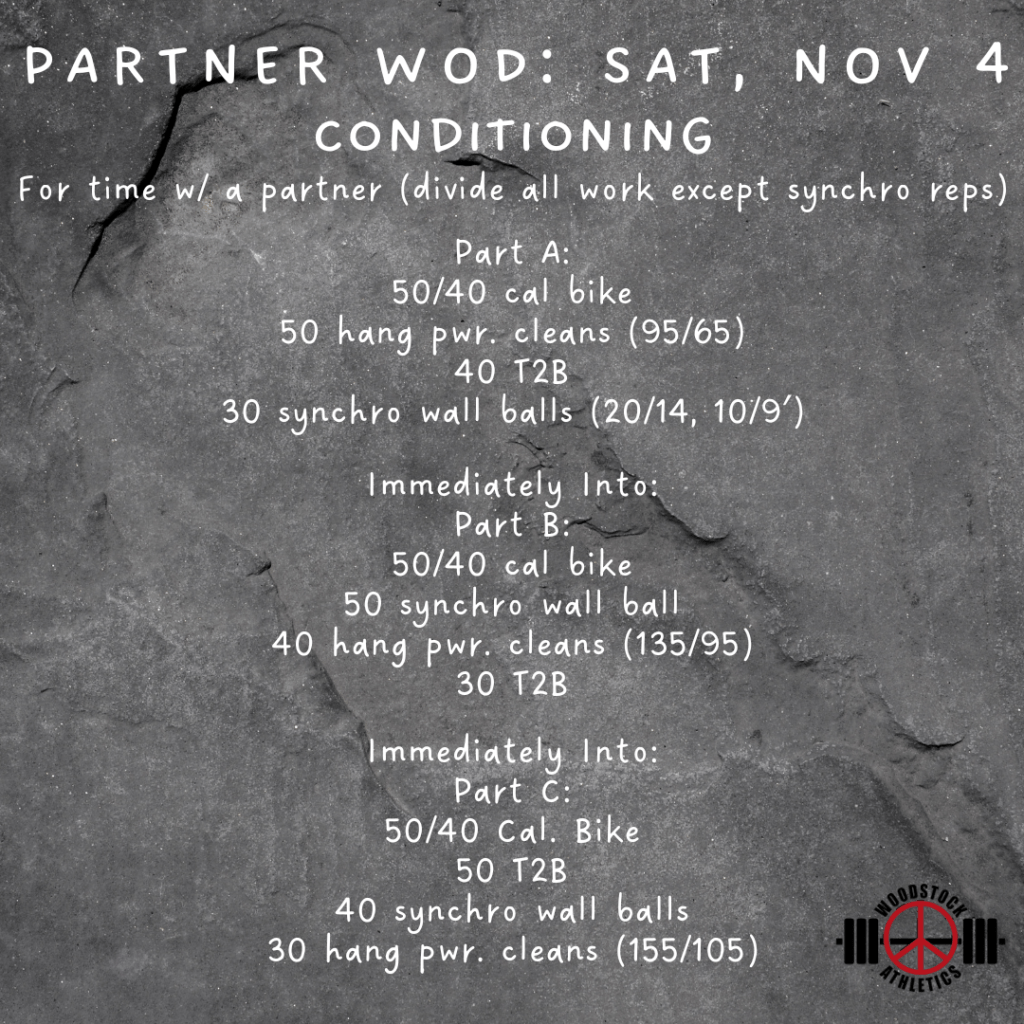 Partner WOD & Barbell Club: Saturday, November 4 Posted bySteph VermeychukNovember 4, 2023October 29, 2023Posted inWorkout of the Day Share this: Click to share on X (Opens in new window) X Click to share on Facebook (Opens in new window) Facebook Like Loading... Related