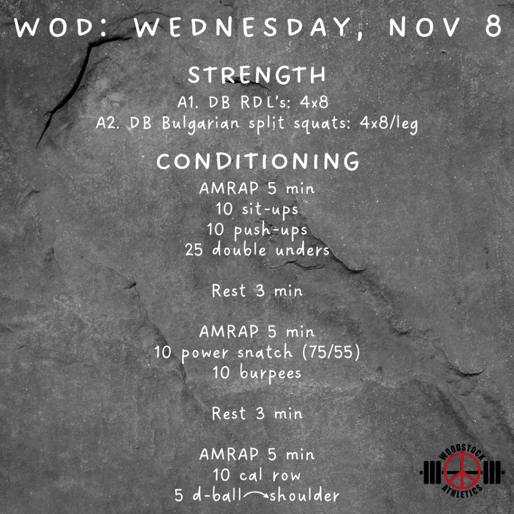 WOD: Wednesday, November 8 Posted bySteph VermeychukNovember 8, 2023November 6, 2023Posted inWorkout of the Day Share this: Click to share on X (Opens in new window) X Click to share on Facebook (Opens in new window) Facebook Like Loading... Related