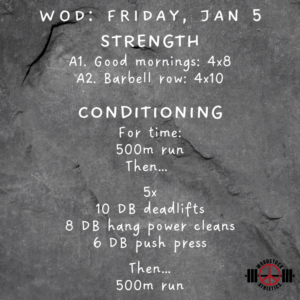 WOD: Friday, January 5 Posted bySteph VermeychukJanuary 5, 2024December 31, 2023Posted inWorkout of the Day Share this: Click to share on X (Opens in new window) X Click to share on Facebook (Opens in new window) Facebook Like Loading... Related