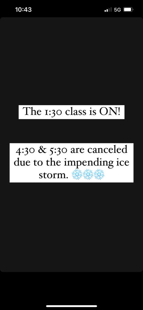 4:30 & 5:30 Canceled TODAY, Tuesday, January 16 Posted bySteph VermeychukJanuary 16, 2024Posted inUncategorized Share this: Click to share on X (Opens in new window) X Click to share on Facebook (Opens in new window) Facebook Like Loading... Related