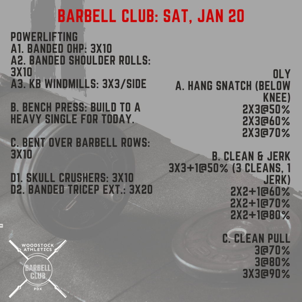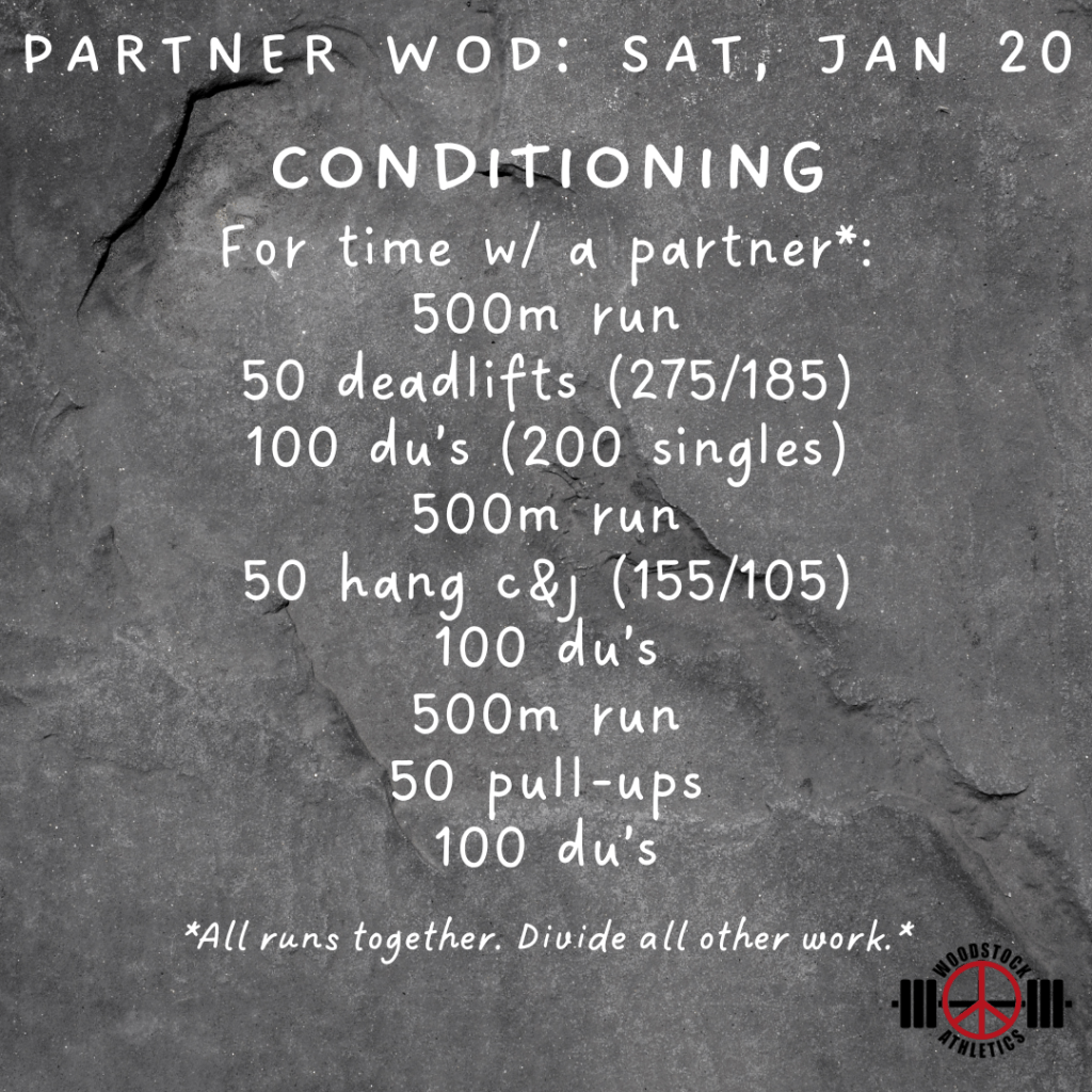 Partner WOD & Barbell Club: Saturday, January 20 Posted bySteph VermeychukJanuary 20, 2024January 14, 2024Posted inWorkout of the Day Share this: Click to share on X (Opens in new window) X Click to share on Facebook (Opens in new window) Facebook Like Loading... Related