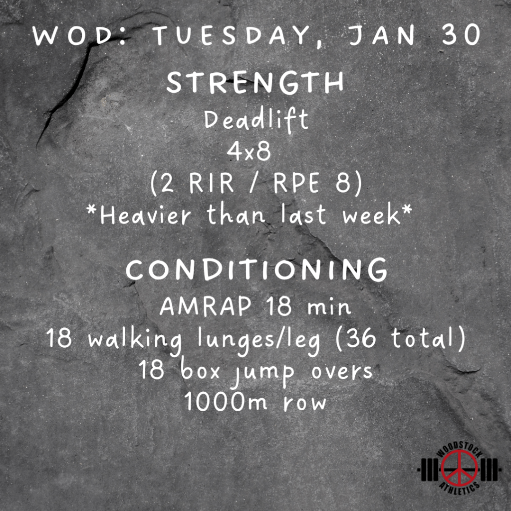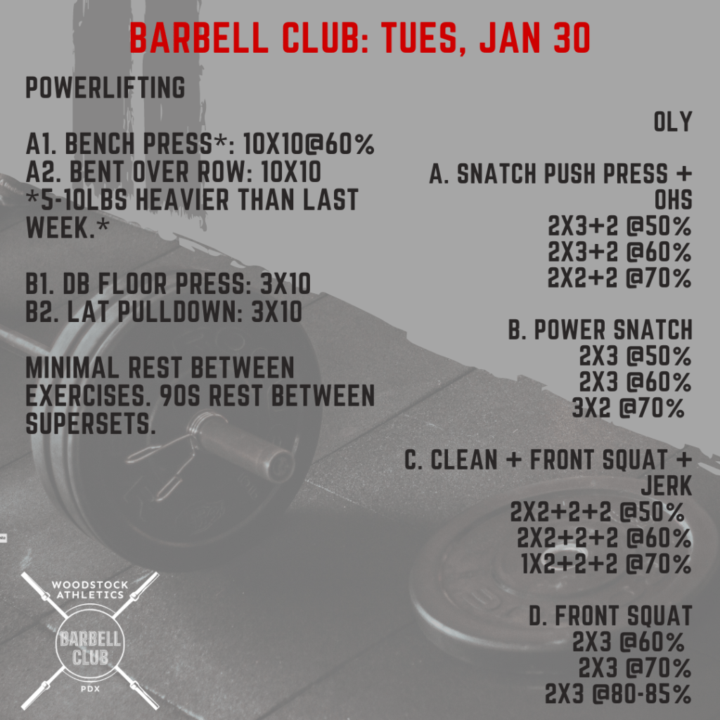 WOD & Barbell Club: Tuesday, January 30 Posted bySteph VermeychukJanuary 30, 2024January 28, 2024Posted inWorkout of the Day Share this: Click to share on X (Opens in new window) X Click to share on Facebook (Opens in new window) Facebook Like Loading... Related