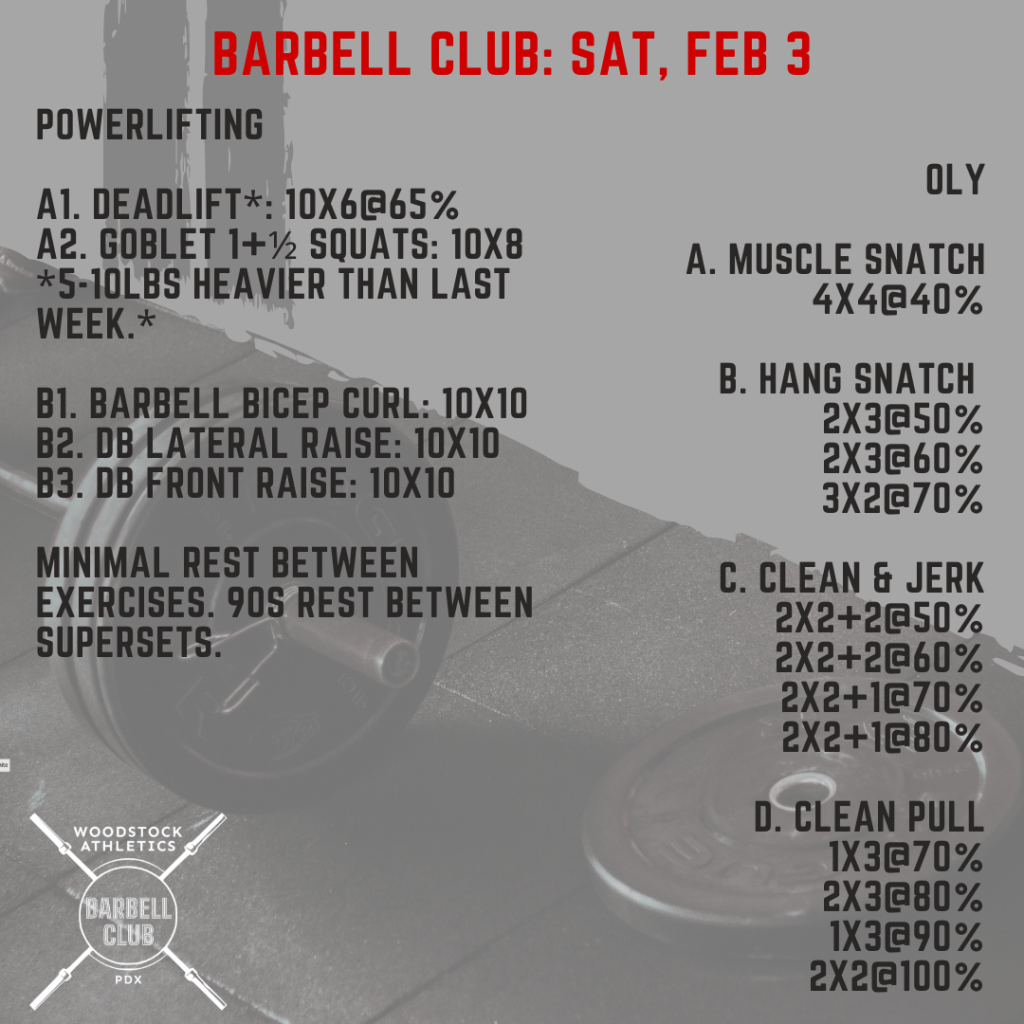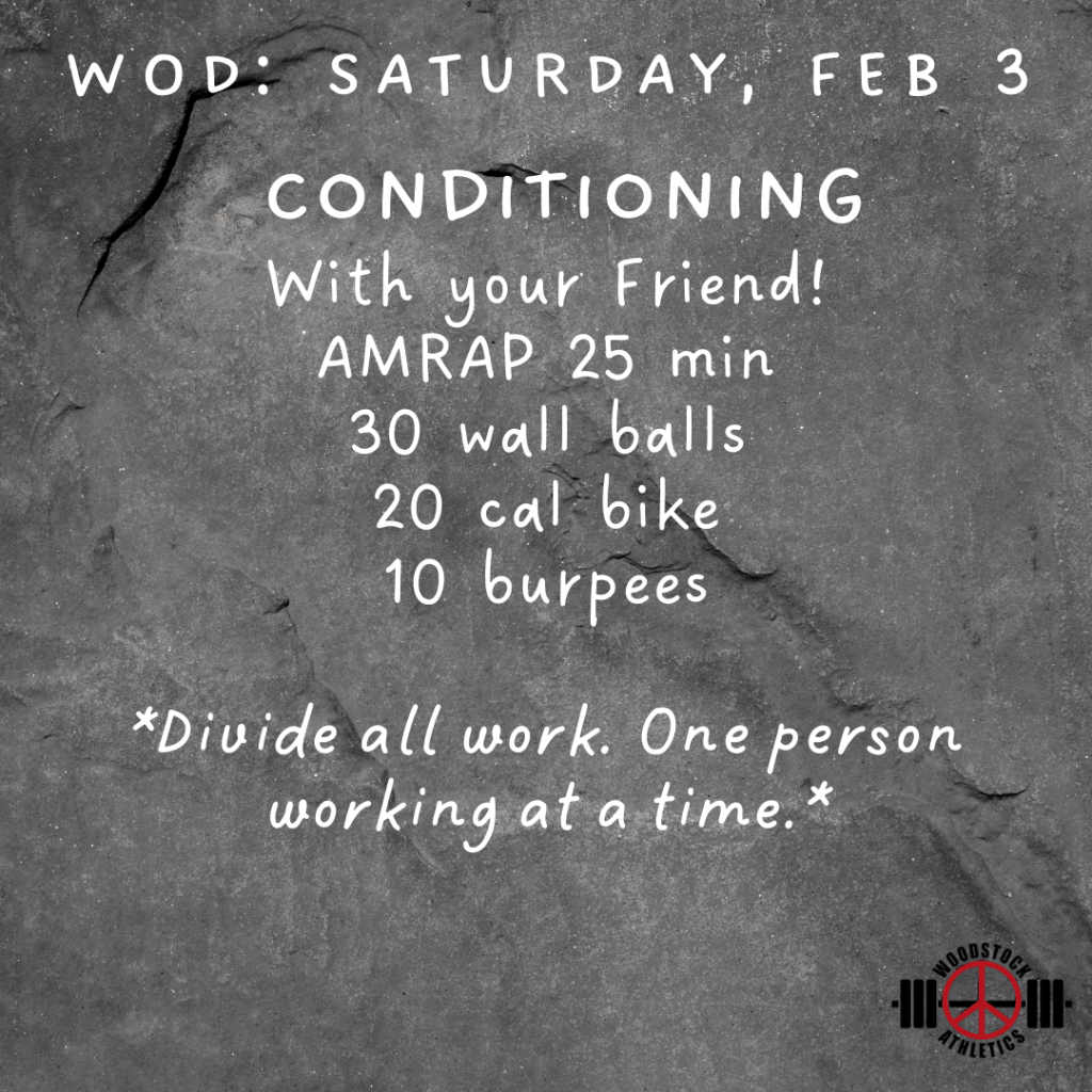 Bring a Friend WOD & Barbell Club: Saturday, Feb 3 Posted bySteph VermeychukFebruary 3, 2024January 28, 2024Posted inWorkout of the Day Share this: Click to share on X (Opens in new window) X Click to share on Facebook (Opens in new window) Facebook Like Loading... Related