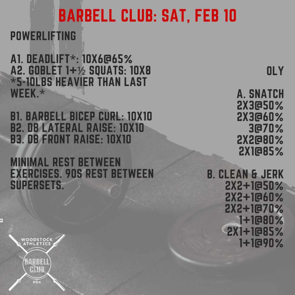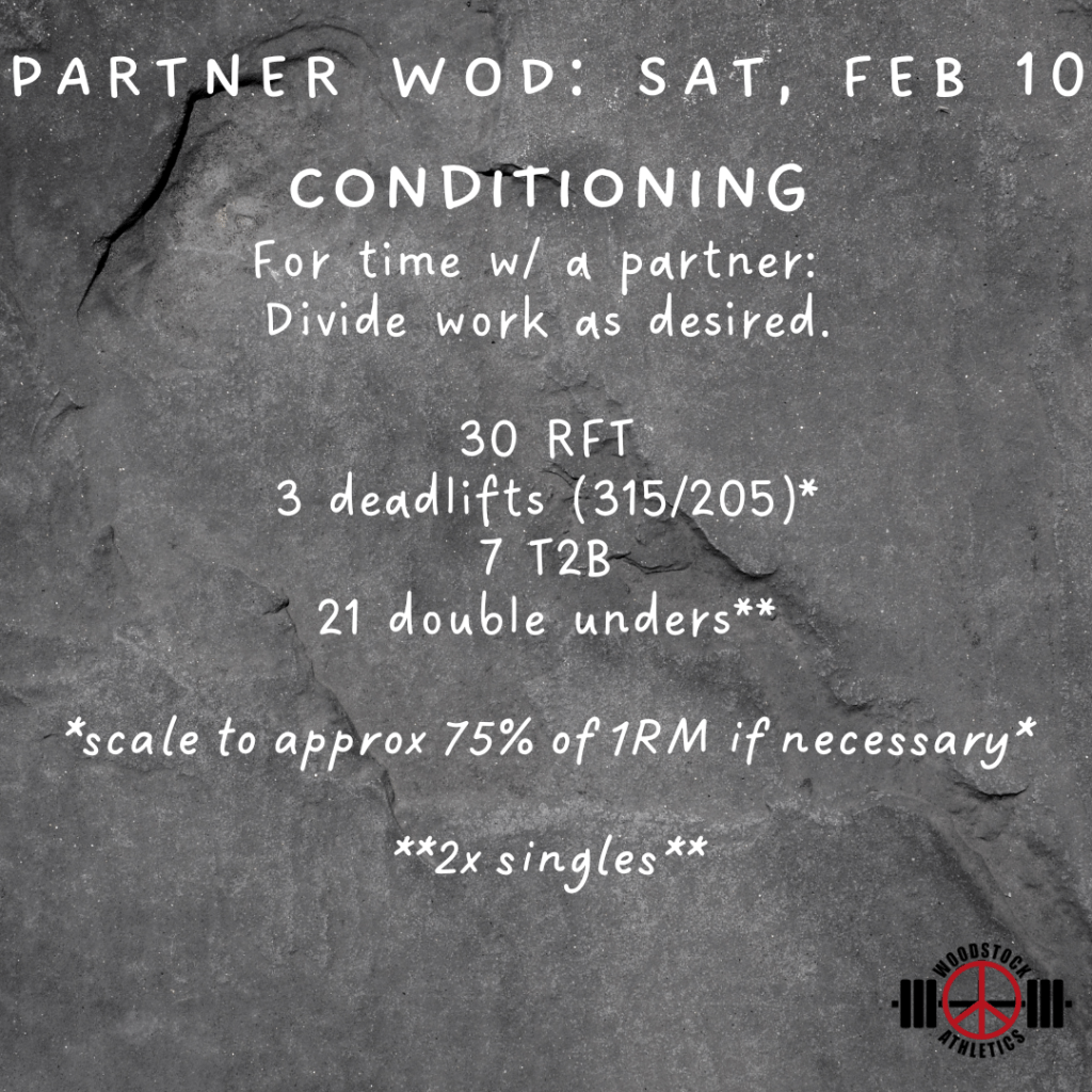 Partner WOD & Barbell Club: Saturday, February 10 Posted bySteph VermeychukFebruary 10, 2024February 4, 2024Posted inWorkout of the Day Share this: Click to share on X (Opens in new window) X Click to share on Facebook (Opens in new window) Facebook Like Loading... Related