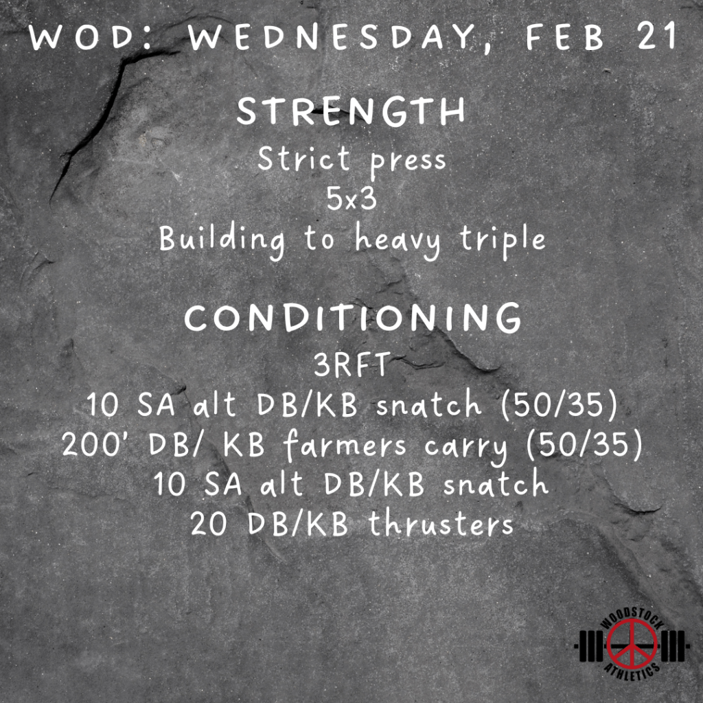 WOD: Wednesday, February 21 Posted bySteph VermeychukFebruary 21, 2024February 18, 2024Posted inWorkout of the Day Share this: Click to share on X (Opens in new window) X Click to share on Facebook (Opens in new window) Facebook Like Loading... Related