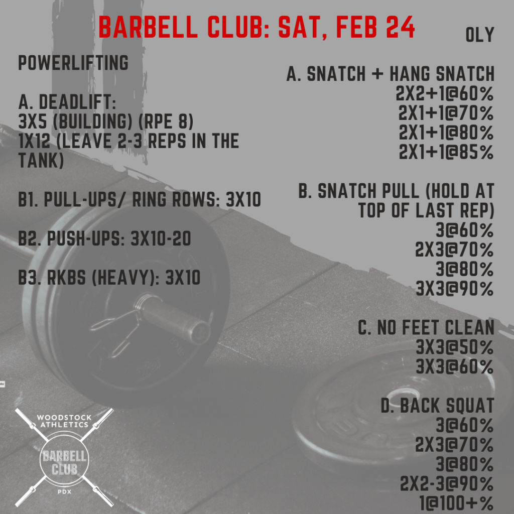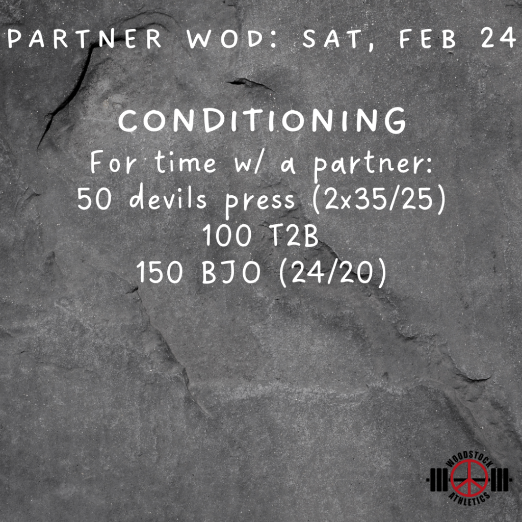 Partner WOD & Barbell Club: Saturday, February 24 Posted bySteph VermeychukFebruary 24, 2024February 18, 2024Posted inWorkout of the Day Share this: Click to share on X (Opens in new window) X Click to share on Facebook (Opens in new window) Facebook Like Loading... Related