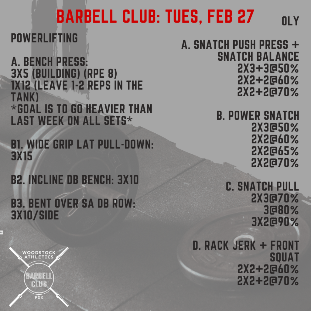 WOD & Barbell Club: Tuesday, February 27 Posted bySteph VermeychukFebruary 27, 2024February 25, 2024Posted inWorkout of the Day Share this: Click to share on X (Opens in new window) X Click to share on Facebook (Opens in new window) Facebook Like Loading... Related