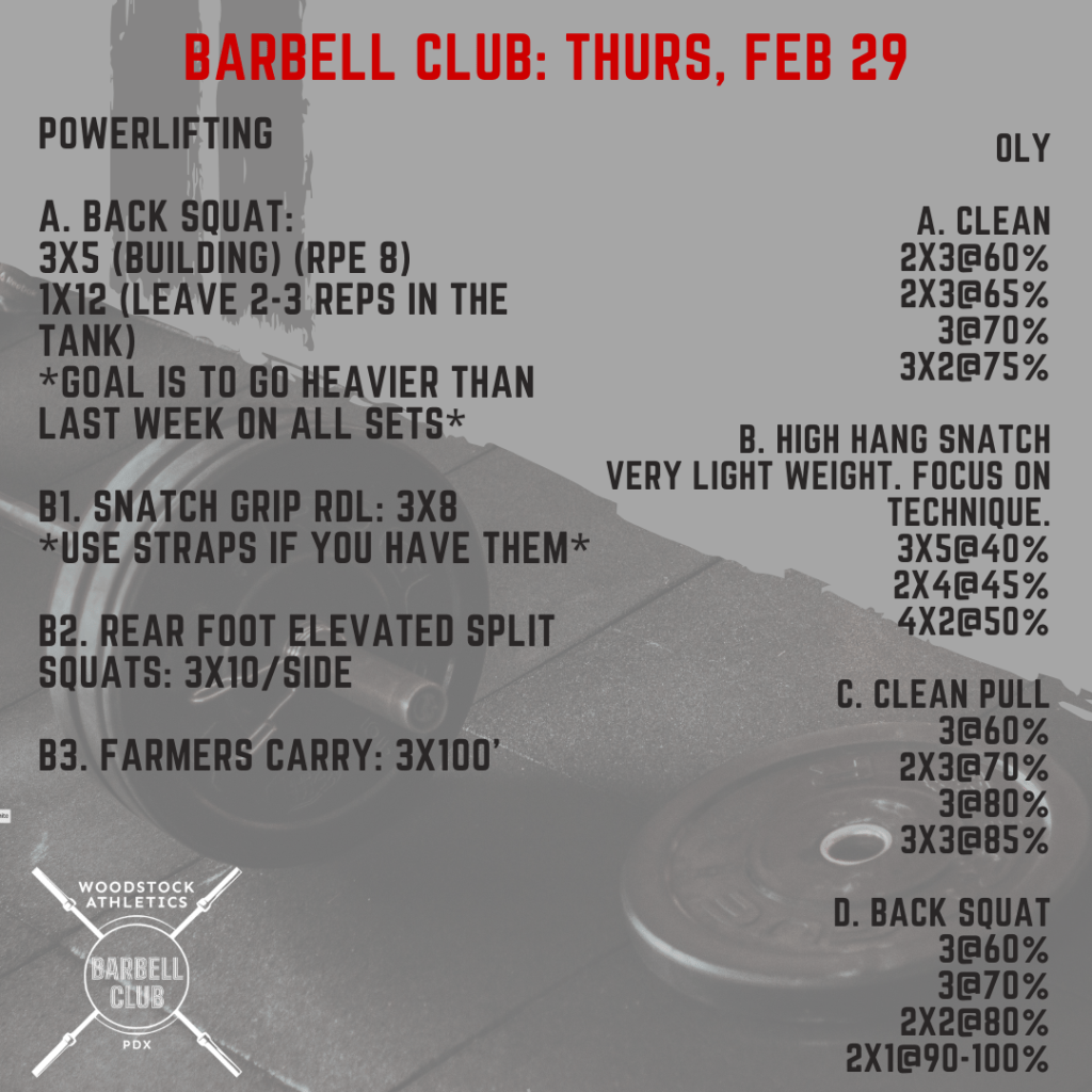 WOD & Barbell Club: Thursday, February 29 Posted bySteph VermeychukFebruary 29, 2024February 25, 2024Posted inWorkout of the Day Share this: Click to share on X (Opens in new window) X Click to share on Facebook (Opens in new window) Facebook Like Loading... Related