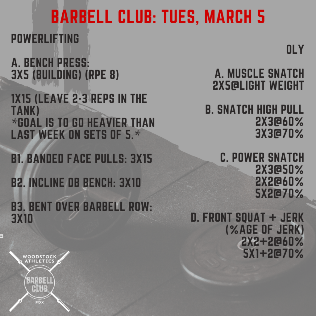 WOD & Barbell Club: Tuesday, March 5 Posted bySteph VermeychukMarch 5, 2024March 3, 2024Posted inWorkout of the Day Share this: Click to share on X (Opens in new window) X Click to share on Facebook (Opens in new window) Facebook Like Loading... Related