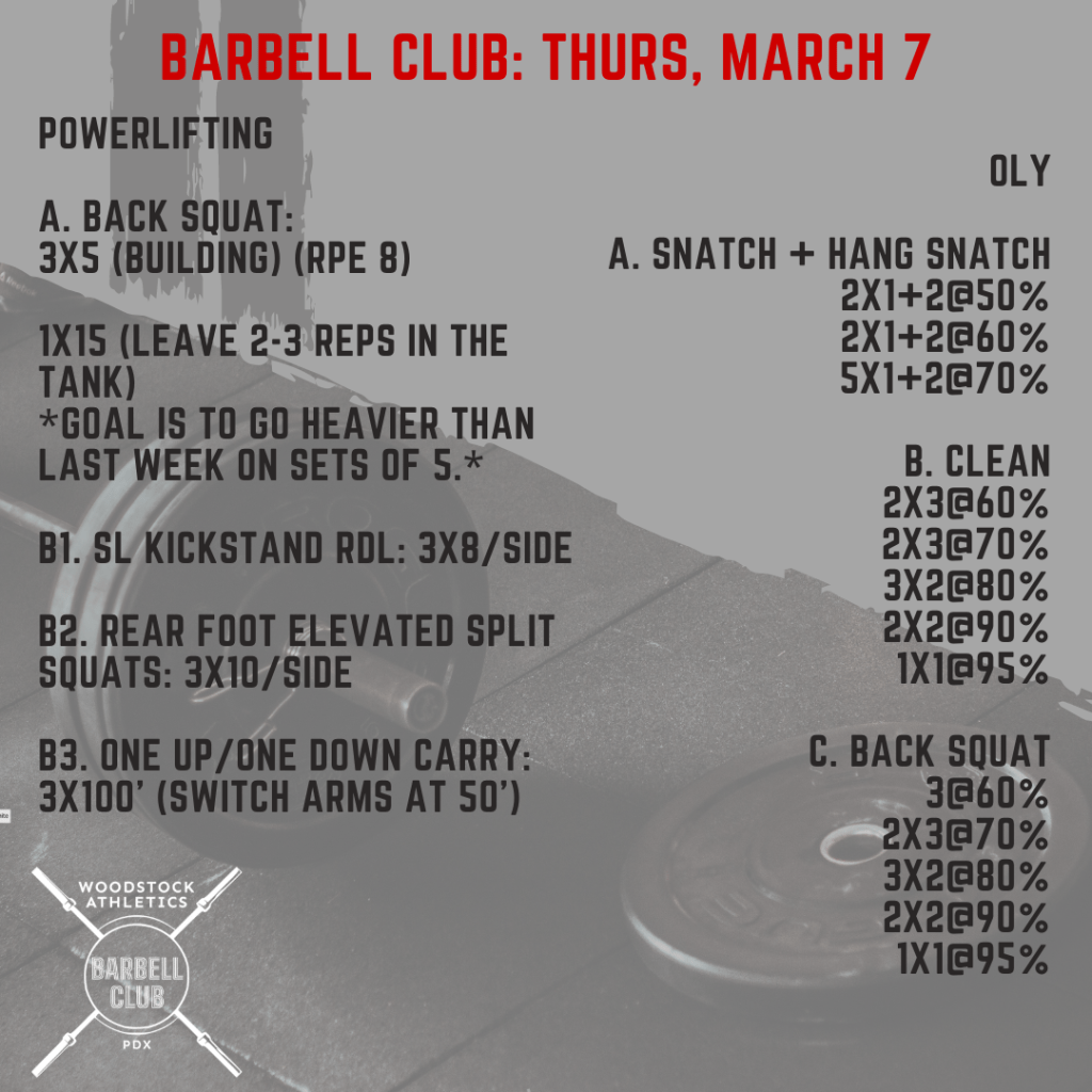 WOD & Barbell Club: Thursday, March 7 Posted bySteph VermeychukMarch 7, 2024March 3, 2024Posted inWorkout of the Day Share this: Click to share on X (Opens in new window) X Click to share on Facebook (Opens in new window) Facebook Like Loading... Related