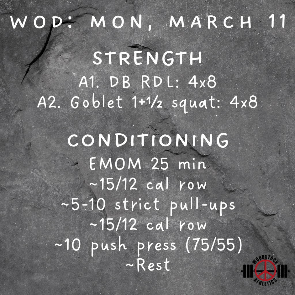 WOD: Monday, March 11 Posted bySteph VermeychukMarch 11, 2024March 11, 2024Posted inWorkout of the Day Share this: Click to share on X (Opens in new window) X Click to share on Facebook (Opens in new window) Facebook Like Loading... Related