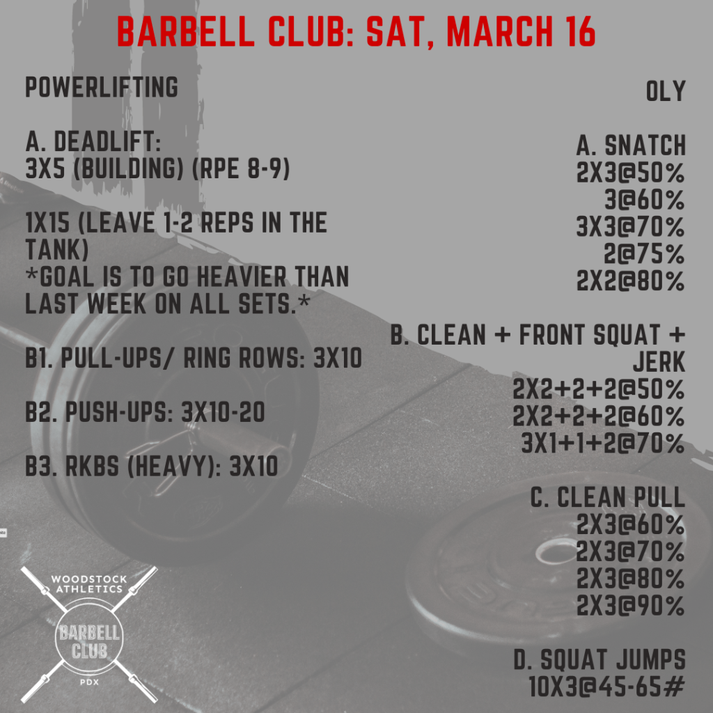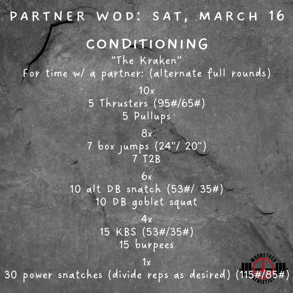 Partner WOD & Barbell Club: Saturday, March 16 Posted bySteph VermeychukMarch 16, 2024March 11, 2024Posted inWorkout of the Day Share this: Click to share on X (Opens in new window) X Click to share on Facebook (Opens in new window) Facebook Like Loading... Related