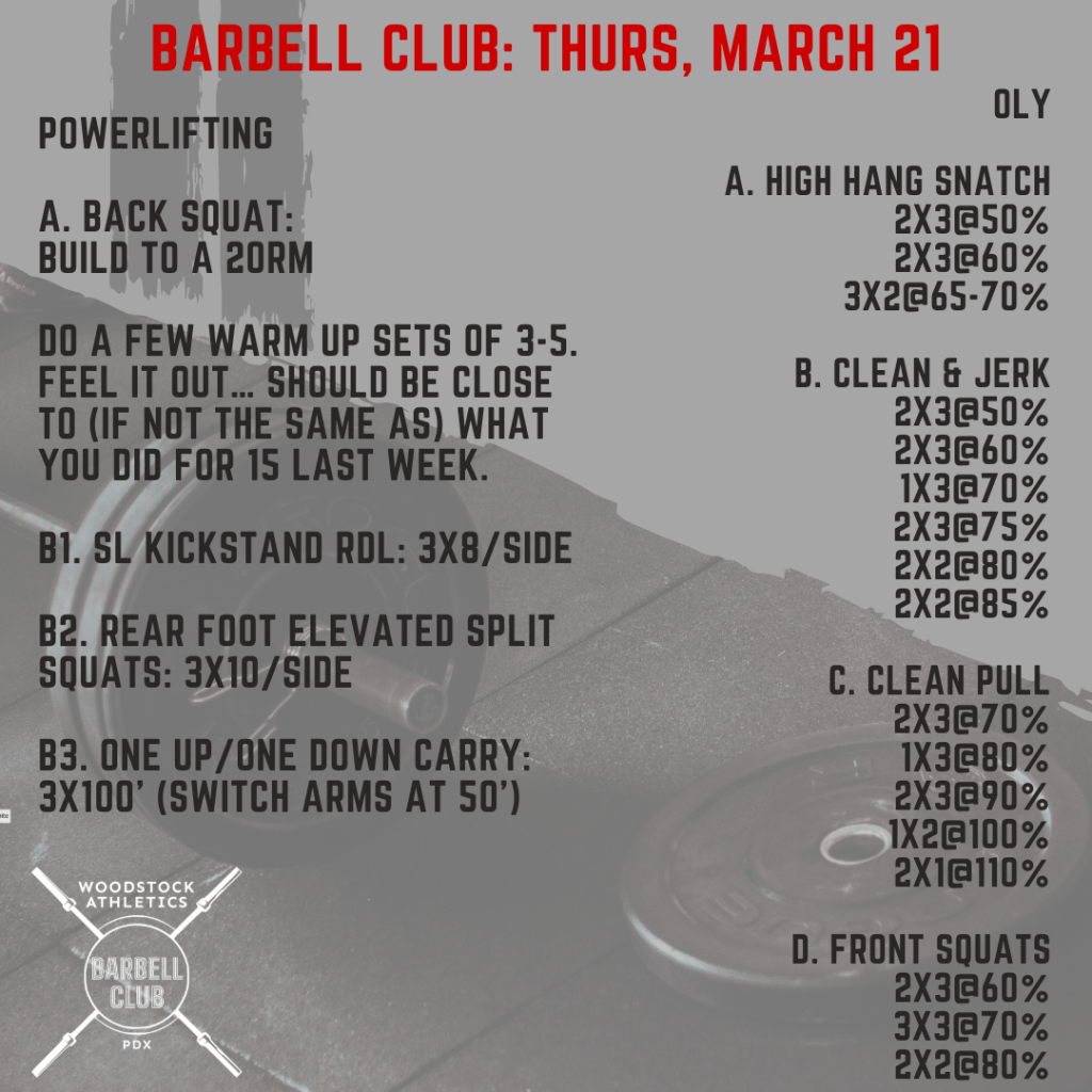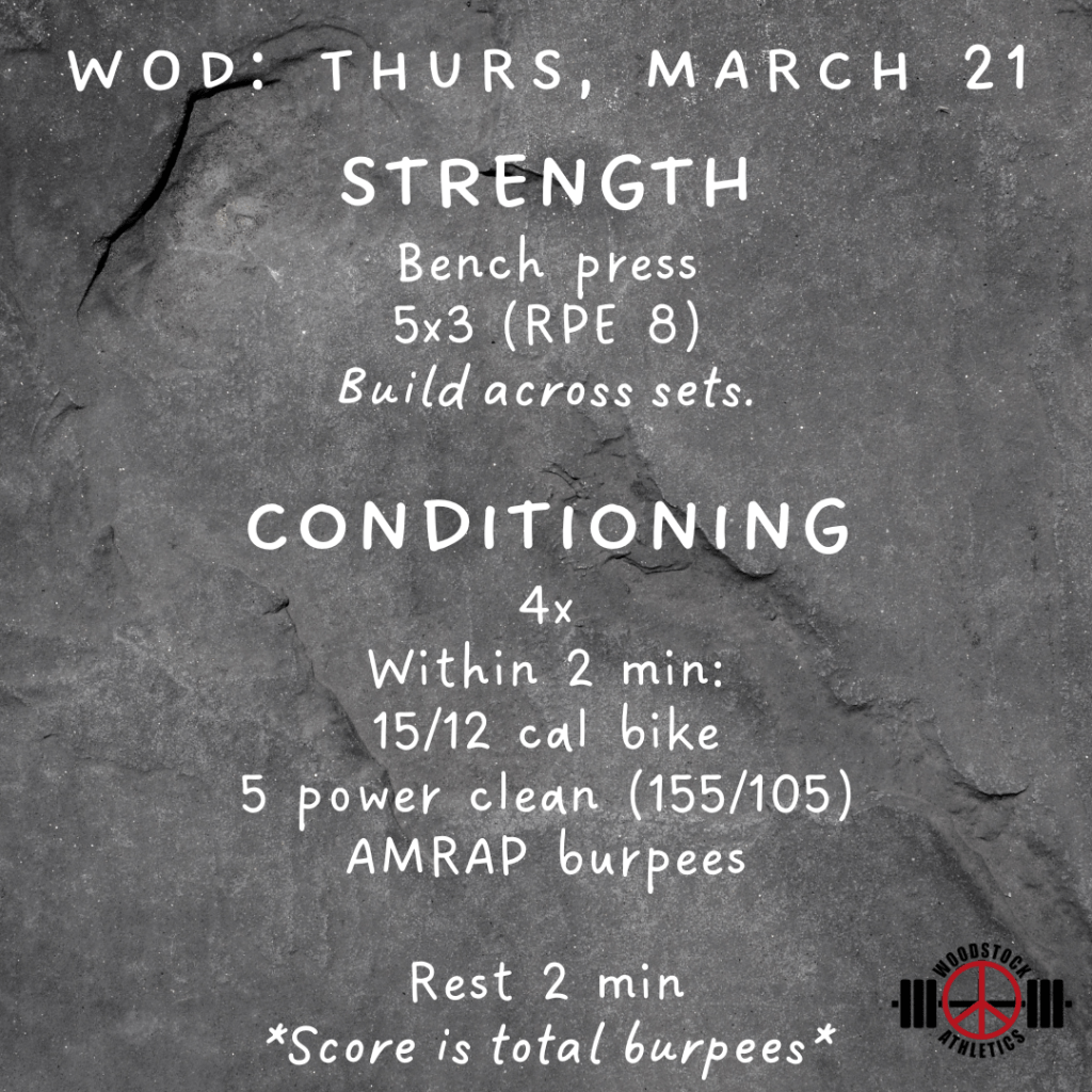 WOD & Barbell Club: Thursday, March 21 Posted bySteph VermeychukMarch 21, 2024March 17, 2024Posted inWorkout of the Day Share this: Click to share on X (Opens in new window) X Click to share on Facebook (Opens in new window) Facebook Like Loading... Related