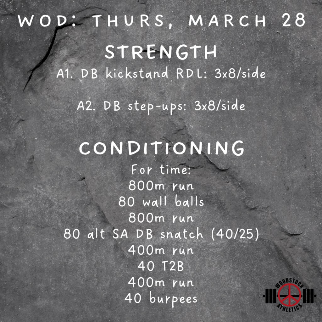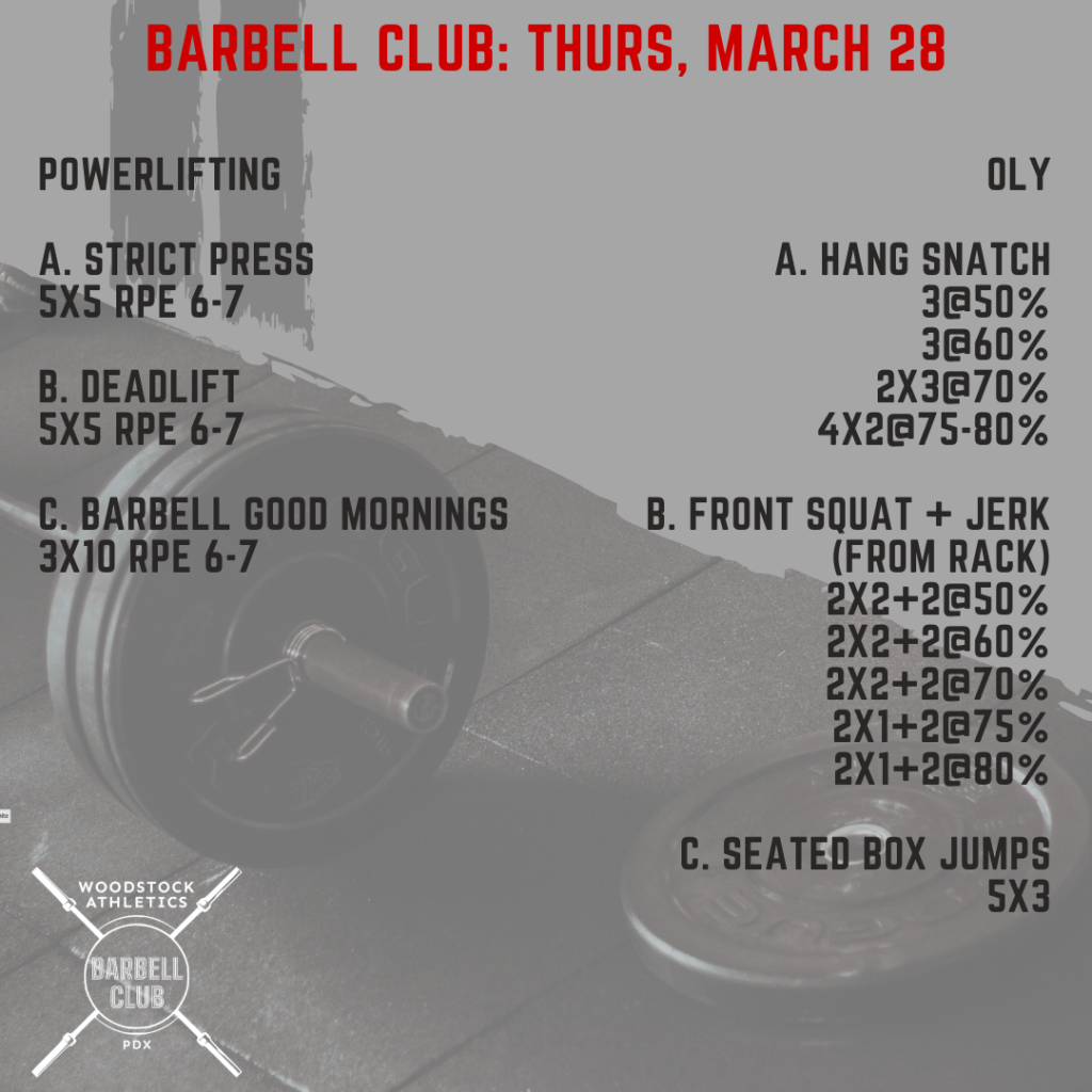 WOD & Barbell Club: Thursday, March 28 Posted bySteph VermeychukMarch 28, 2024March 24, 2024Posted inWorkout of the Day Share this: Click to share on X (Opens in new window) X Click to share on Facebook (Opens in new window) Facebook Like Loading... Related
