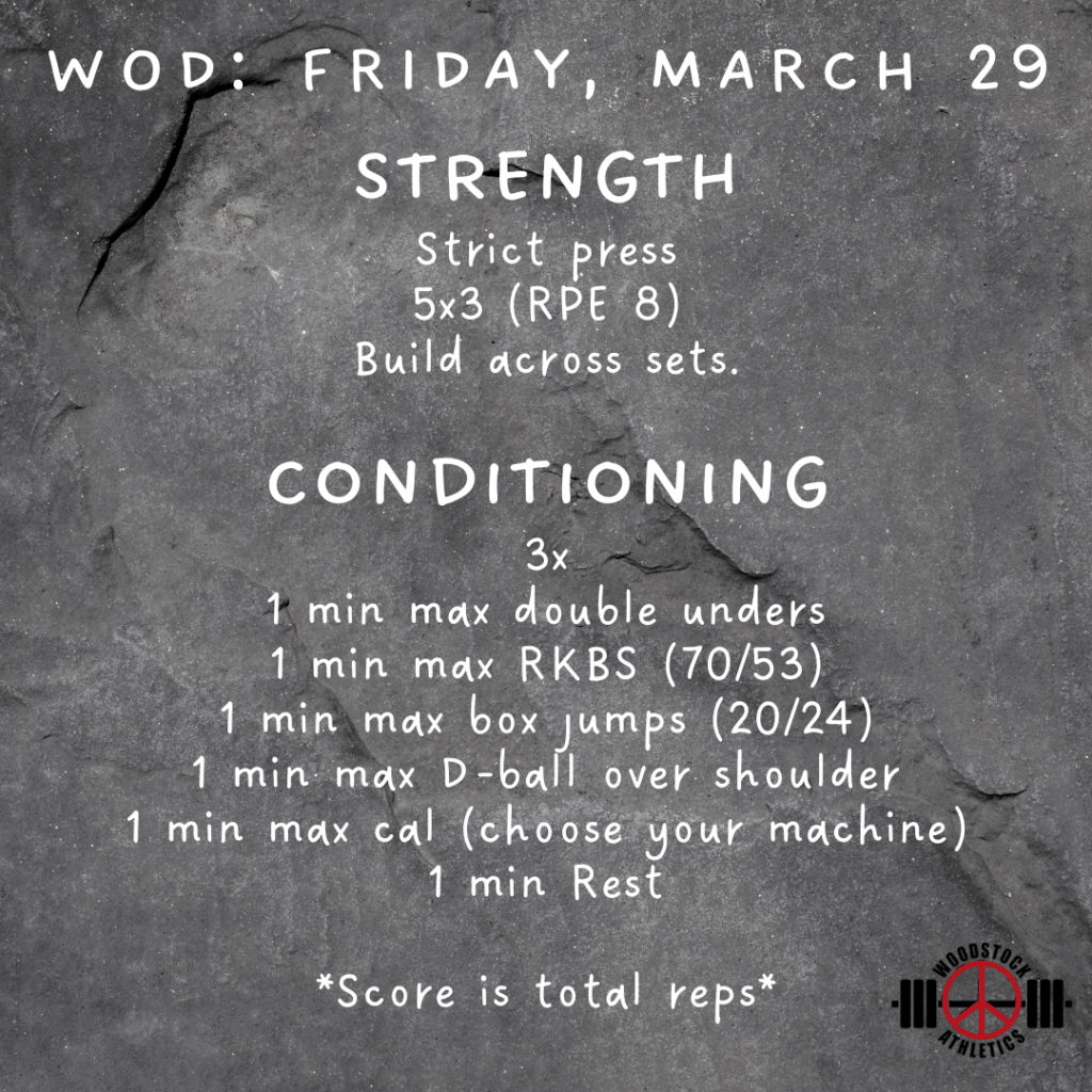 WOD: Friday, March 29 Posted bySteph VermeychukMarch 29, 2024March 24, 2024Posted inWorkout of the Day Share this: Click to share on X (Opens in new window) X Click to share on Facebook (Opens in new window) Facebook Like Loading... Related