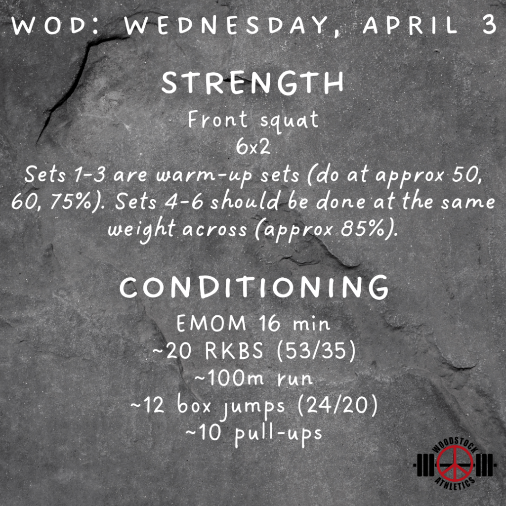 WOD: Wednesday, April 3 Posted bySteph VermeychukApril 3, 2024March 31, 2024Posted inWorkout of the Day Share this: Click to share on X (Opens in new window) X Click to share on Facebook (Opens in new window) Facebook Like Loading... Related
