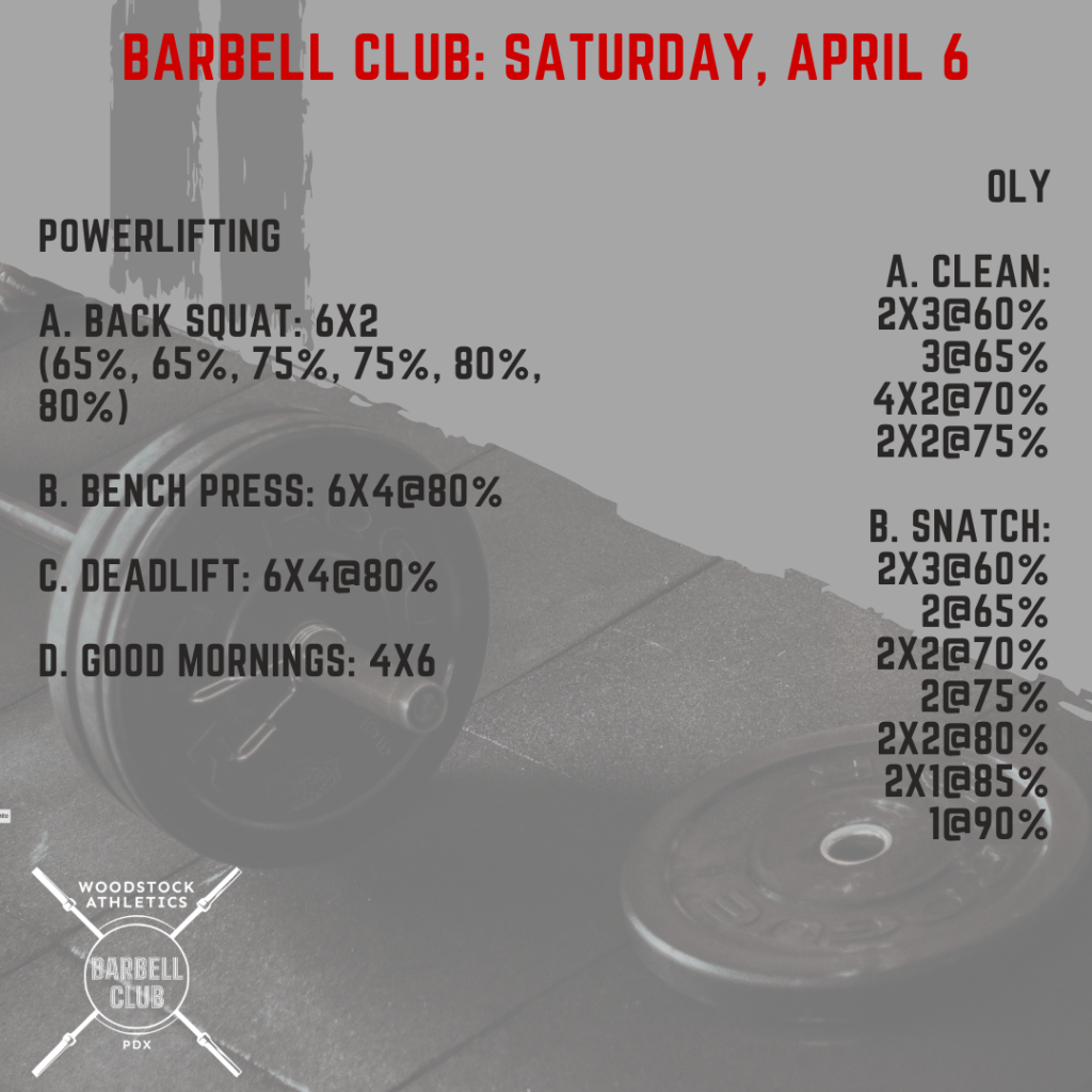 Barbell Club: Saturday, April 6 Posted bySteph VermeychukApril 6, 2024March 31, 2024Posted inWorkout of the Day Share this: Click to share on X (Opens in new window) X Click to share on Facebook (Opens in new window) Facebook Like Loading... Related