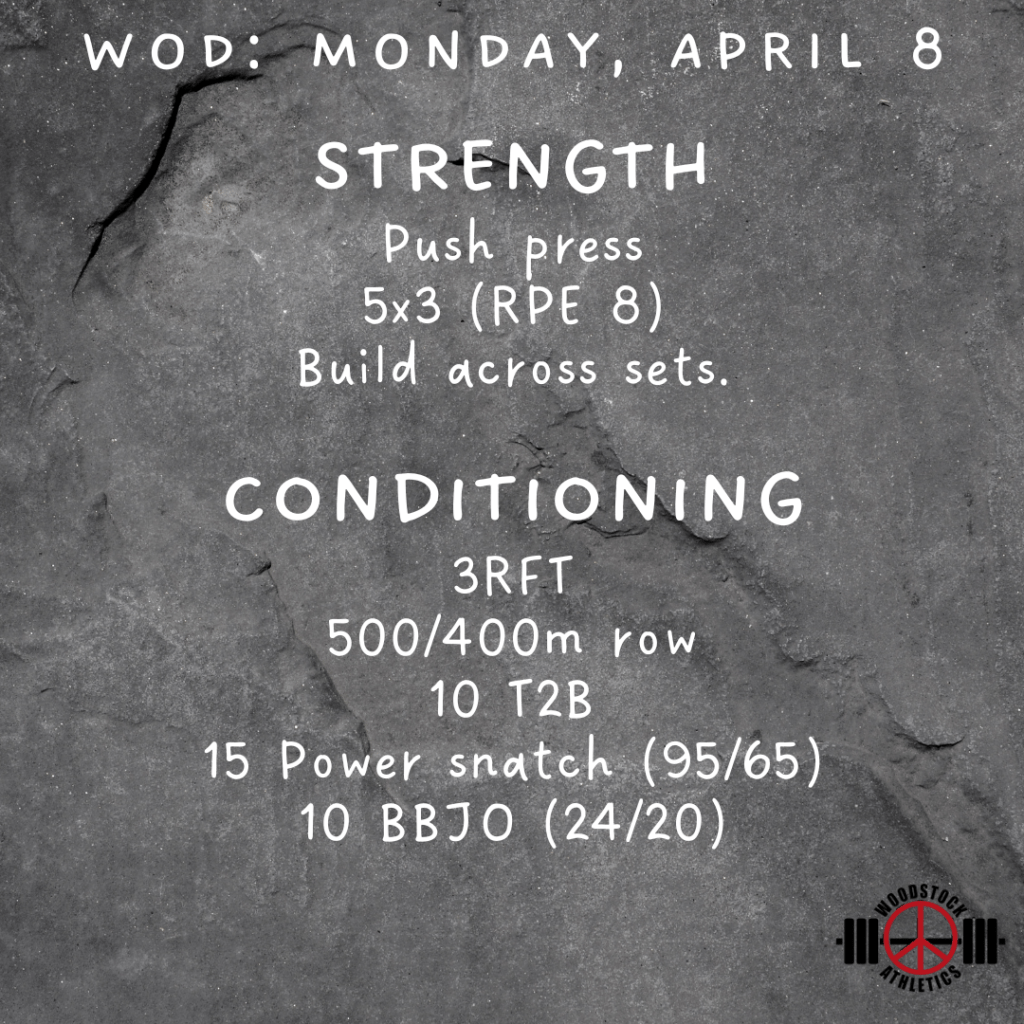 WOD: Monday, April 8 Posted bySteph VermeychukApril 8, 2024April 7, 2024Posted inWorkout of the Day Share this: Click to share on X (Opens in new window) X Click to share on Facebook (Opens in new window) Facebook Like Loading... Related
