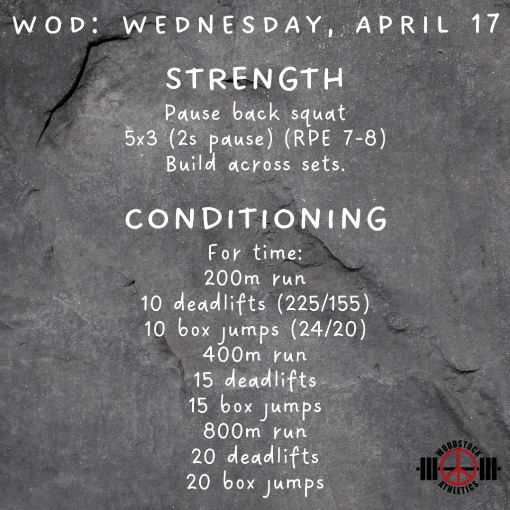 WOD: Wednesday, April 17 Posted bySteph VermeychukApril 17, 2024April 14, 2024Posted inWorkout of the Day Share this: Click to share on X (Opens in new window) X Click to share on Facebook (Opens in new window) Facebook Like Loading... Related