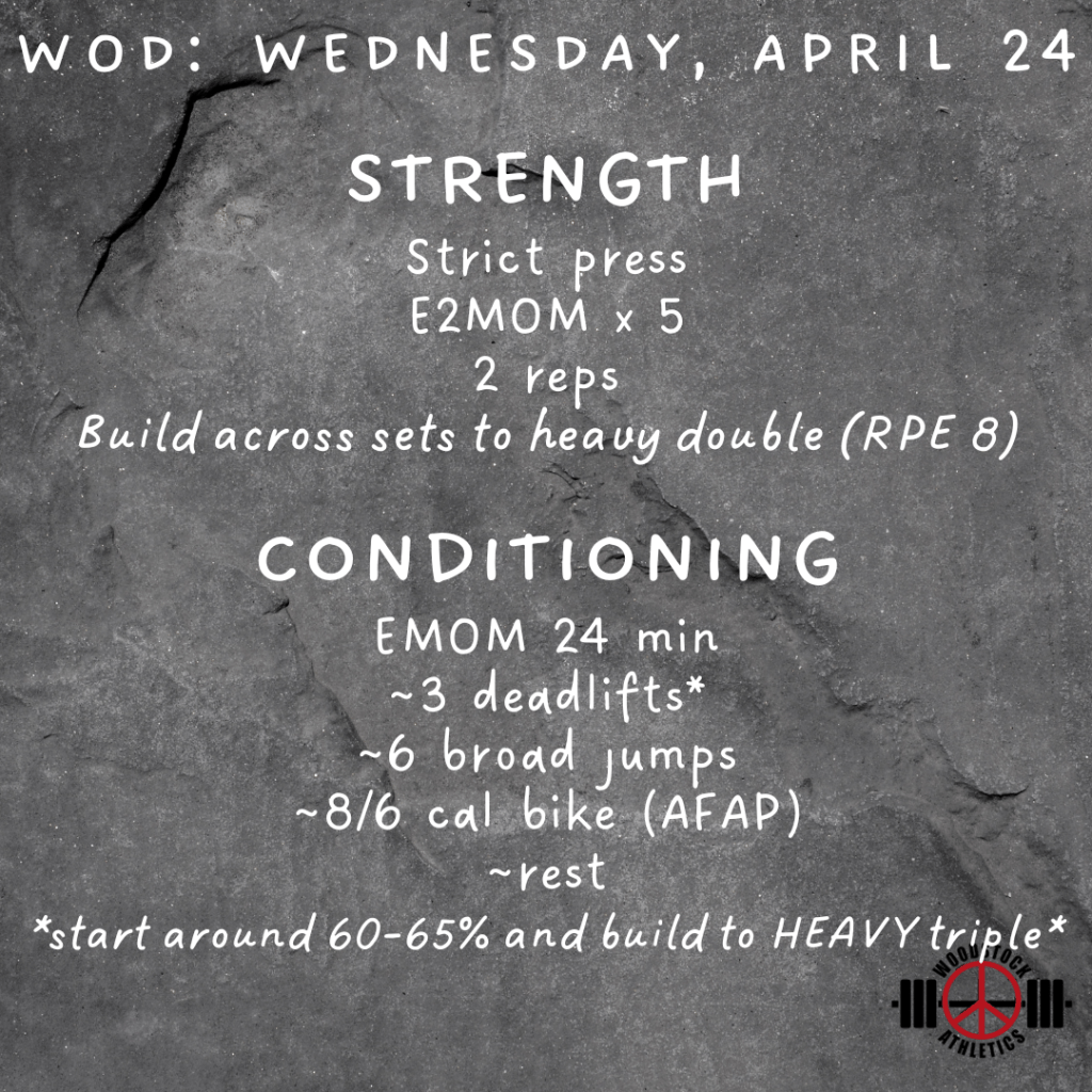 WOD: Wednesday, April 24 Posted bySteph VermeychukApril 24, 2024April 21, 2024Posted inWorkout of the Day Share this: Click to share on X (Opens in new window) X Click to share on Facebook (Opens in new window) Facebook Like Loading... Related