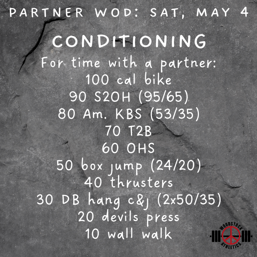 Partner WOD & Barbell Club: Saturday, May 4 Posted bySteph VermeychukMay 4, 2024April 28, 2024Posted inWorkout of the Day Share this: Click to share on X (Opens in new window) X Click to share on Facebook (Opens in new window) Facebook Like Loading... Related