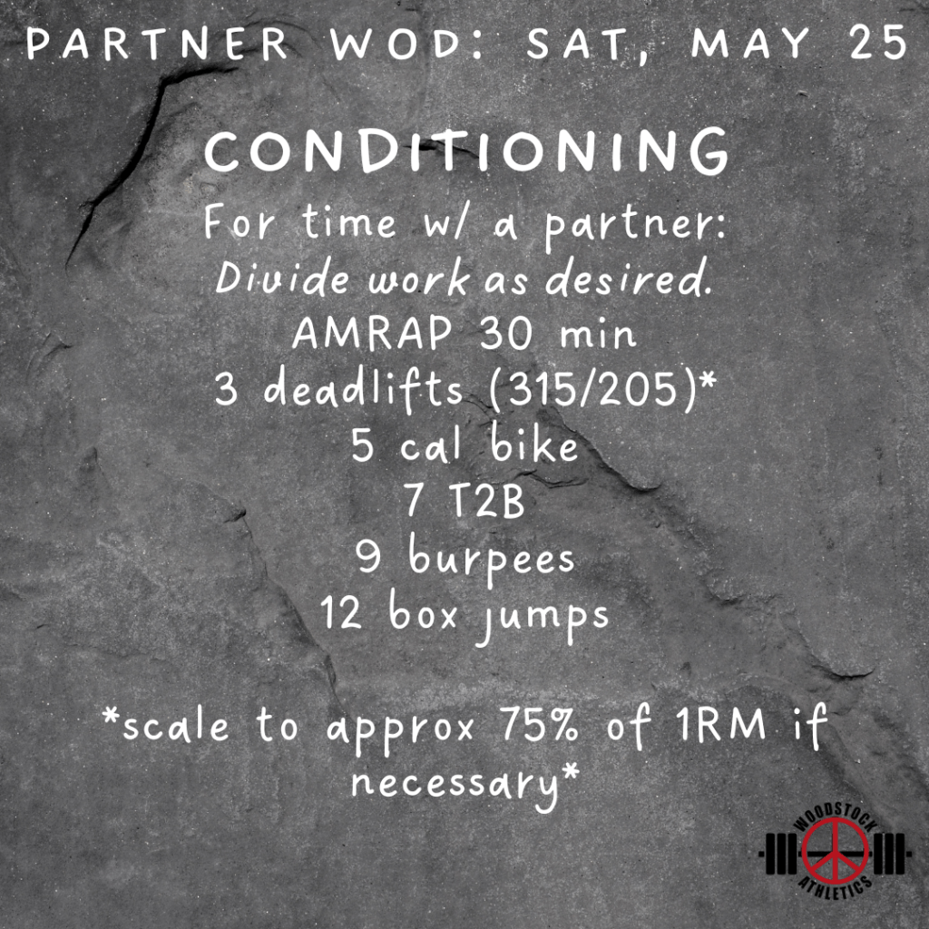 Partner WOD & Barbell Club: Saturday, May 25 Posted bySteph VermeychukMay 25, 2024May 18, 2024Posted inWorkout of the Day Share this: Click to share on X (Opens in new window) X Click to share on Facebook (Opens in new window) Facebook Like Loading... Related
