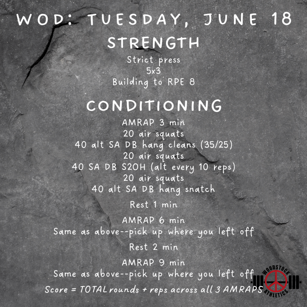 WOD & Barbell Club: Tuesday, June 18 Posted bySteph VermeychukJune 18, 2024June 16, 2024Posted inWorkout of the Day Share this: Click to share on X (Opens in new window) X Click to share on Facebook (Opens in new window) Facebook Like Loading... Related