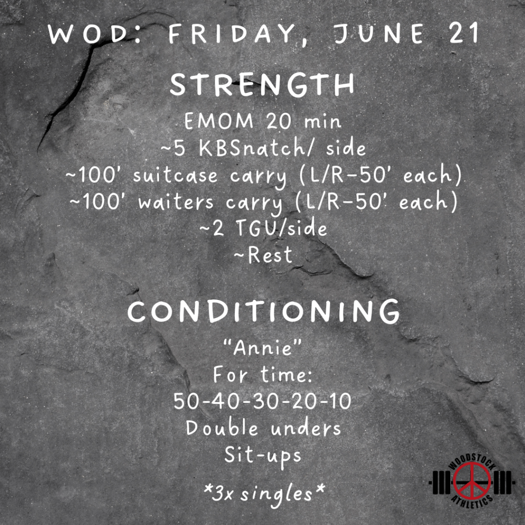 WOD: Friday, June 21 Posted bySteph VermeychukJune 21, 2024June 16, 2024Posted inWorkout of the Day Share this: Click to share on X (Opens in new window) X Click to share on Facebook (Opens in new window) Facebook Like Loading... Related