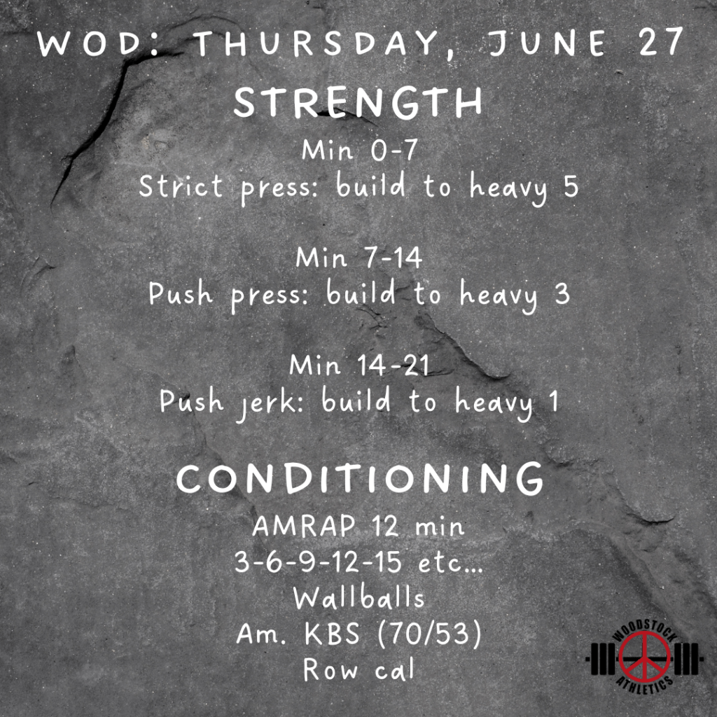 WOD & Barbell Club: Thursday, June 27 Posted bySteph VermeychukJune 27, 2024June 23, 2024Posted inWorkout of the Day Share this: Click to share on X (Opens in new window) X Click to share on Facebook (Opens in new window) Facebook Like Loading... Related