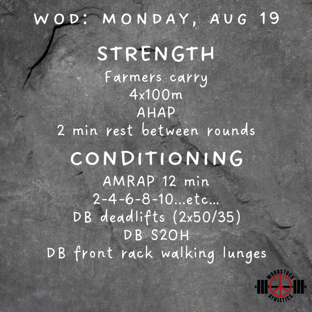 WOD: Monday, August 19 Posted bySteph VermeychukAugust 19, 2024August 17, 2024Posted inWorkout of the Day Share this: Click to share on X (Opens in new window) X Click to share on Facebook (Opens in new window) Facebook Like Loading... Related