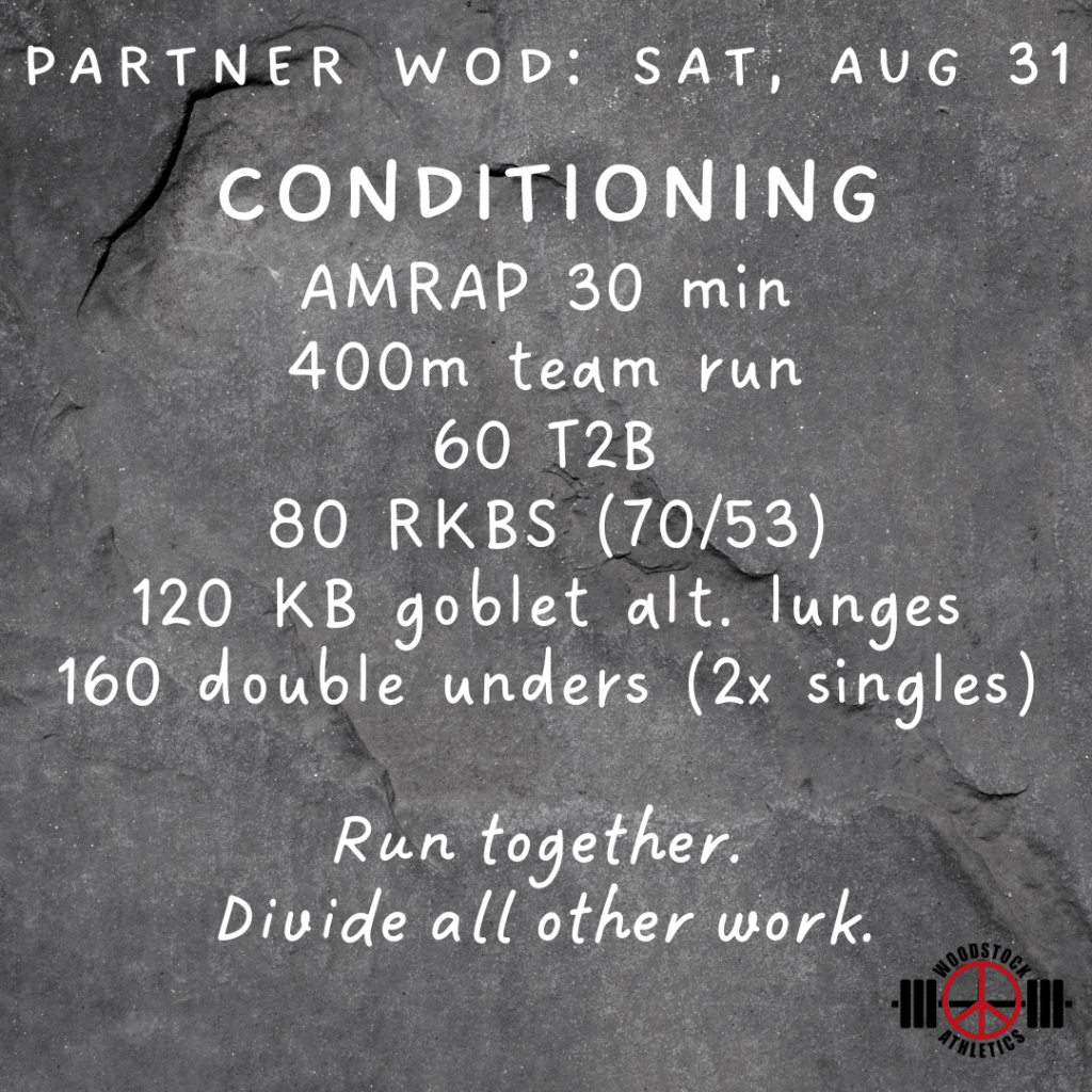 Partner WOD & Barbell Club: August 31 Posted bySteph VermeychukAugust 31, 2024August 25, 2024Posted inWorkout of the Day Share this: Click to share on X (Opens in new window) X Click to share on Facebook (Opens in new window) Facebook Like Loading... Related