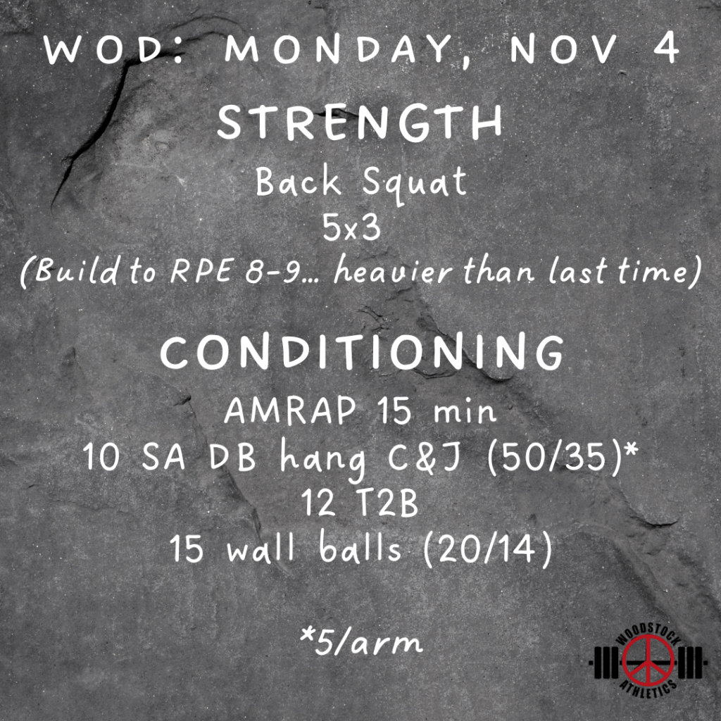 WOD: Monday, November 4 Posted bySteph VermeychukNovember 4, 2024November 3, 2024Posted inWorkout of the Day Share this: Click to share on X (Opens in new window) X Click to share on Facebook (Opens in new window) Facebook Like Loading... Related