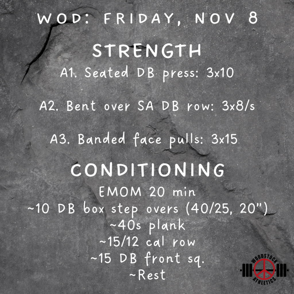 WOD: Friday, November 8 Posted bySteph VermeychukNovember 8, 2024November 3, 2024Posted inUncategorized Share this: Click to share on X (Opens in new window) X Click to share on Facebook (Opens in new window) Facebook Like Loading... Related