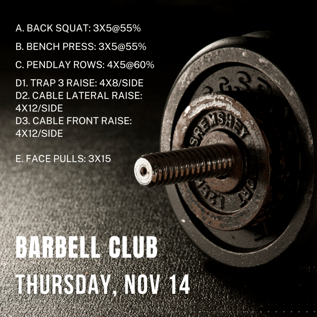 Barbell Club today is light day for squat and bench, and we are doing Pendlay rows instead of deadlifts. *For deadlifts, we will only have light and heavy days each week.*