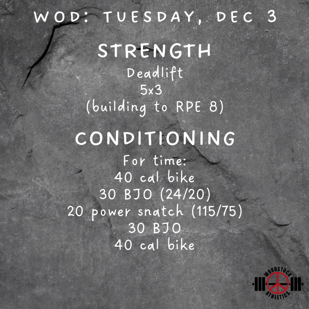 WOD & Barbell Club: Tuesday, Dec 3 Posted bySteph VermeychukDecember 3, 2024December 1, 2024Posted inWorkout of the Day Share this: Click to share on X (Opens in new window) X Click to share on Facebook (Opens in new window) Facebook Like Loading... Related