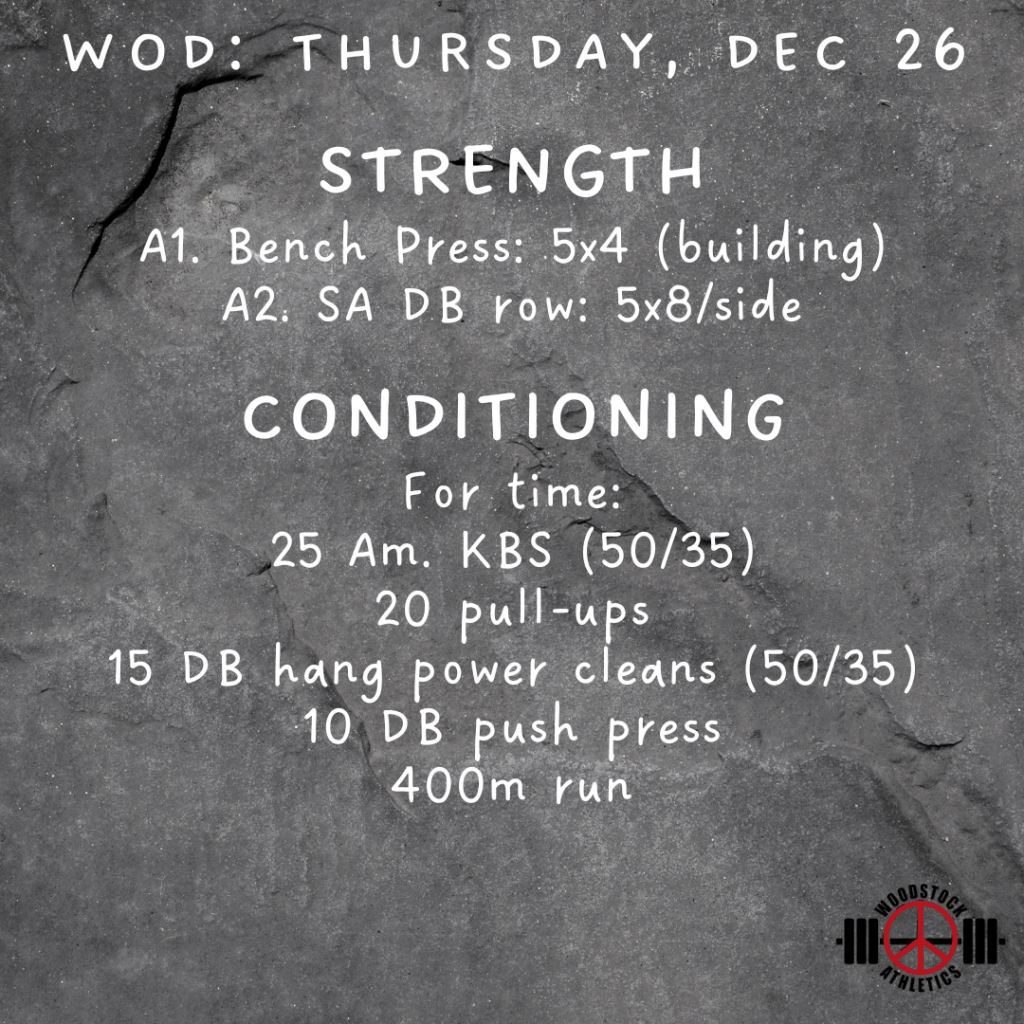 WOD & Barbell Club: Thursday, Dec 26 Posted bySteph VermeychukDecember 26, 2024December 22, 2024Posted inUncategorized Share this: Click to share on X (Opens in new window) X Click to share on Facebook (Opens in new window) Facebook Like Loading... Related