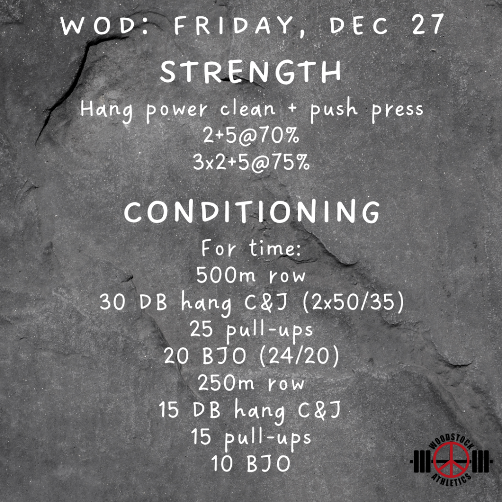 WOD: Friday, December 27 Posted bySteph VermeychukDecember 27, 2024December 22, 2024Posted inUncategorized Share this: Click to share on X (Opens in new window) X Click to share on Facebook (Opens in new window) Facebook Like Loading... Related
