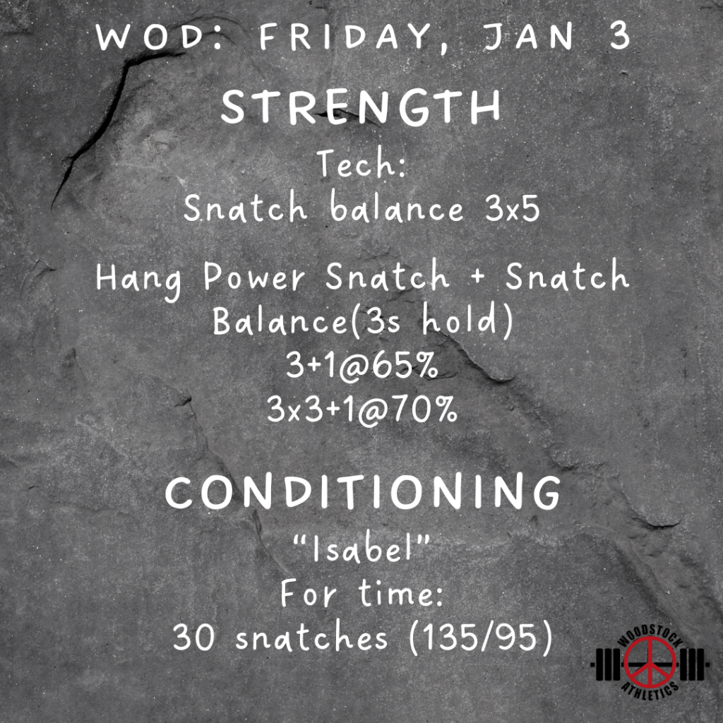 WOD: Friday, January 3 Posted bySteph VermeychukJanuary 3, 2025December 29, 2024Posted inWorkout of the Day Share this: Click to share on X (Opens in new window) X Click to share on Facebook (Opens in new window) Facebook Like Loading... Related