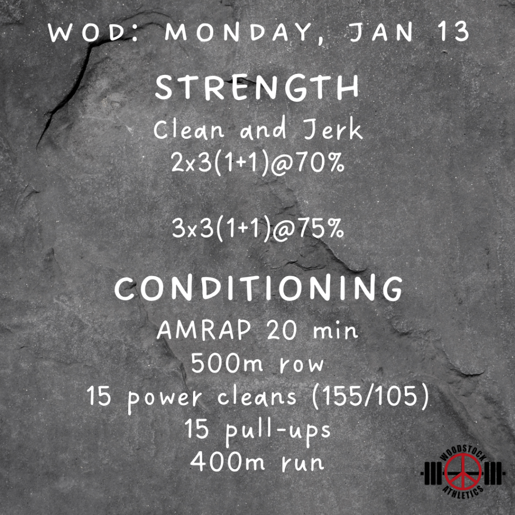 WOD: Monday, January 13 Posted bySteph VermeychukJanuary 13, 2025January 12, 2025Posted inWorkout of the Day Share this: Click to share on X (Opens in new window) X Click to share on Facebook (Opens in new window) Facebook Like Loading... Related