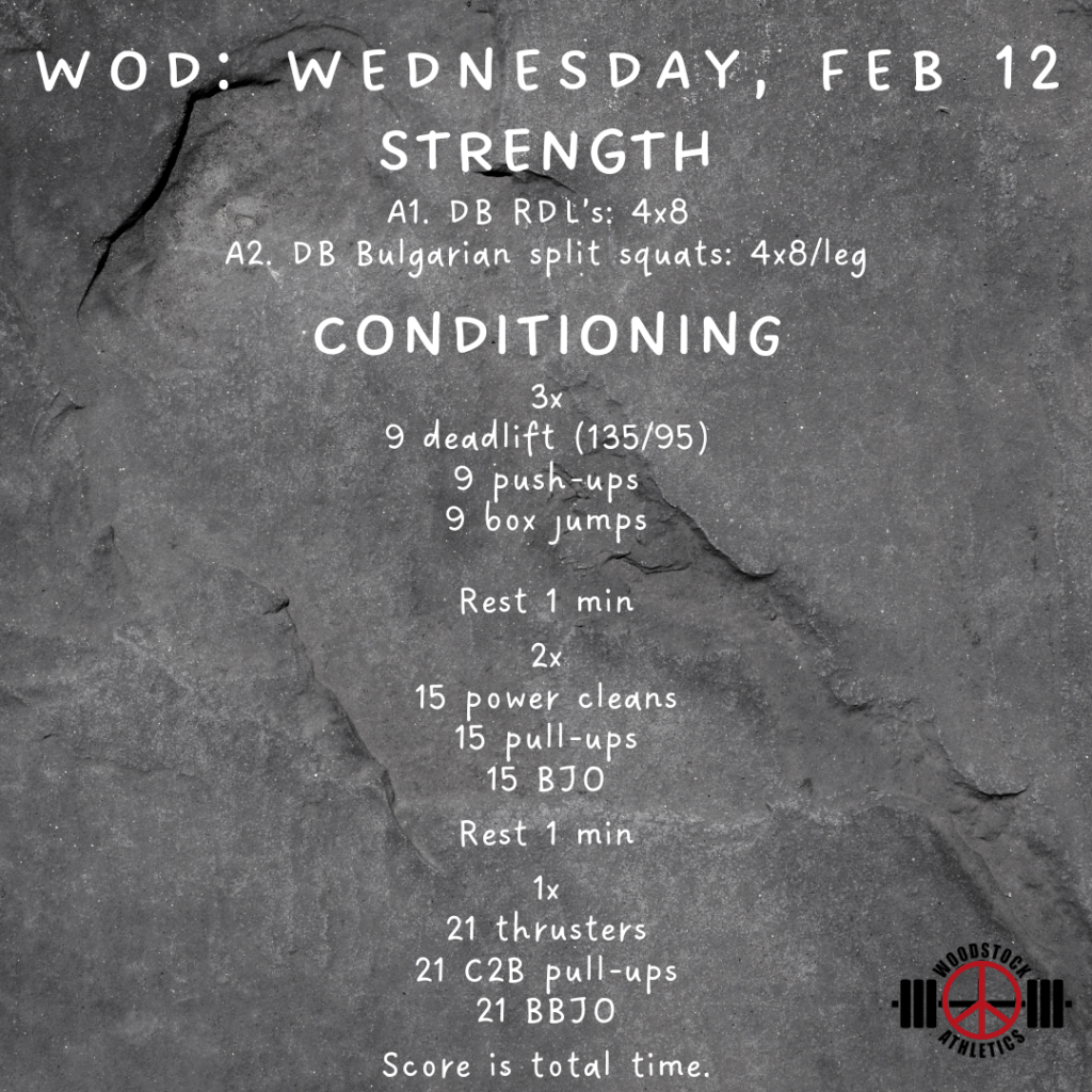 WOD: Wednesday, February 12 Posted bySteph VermeychukFebruary 12, 2025February 8, 2025Posted inWorkout of the Day Share this: Click to share on X (Opens in new window) X Click to share on Facebook (Opens in new window) Facebook Like Loading... Related