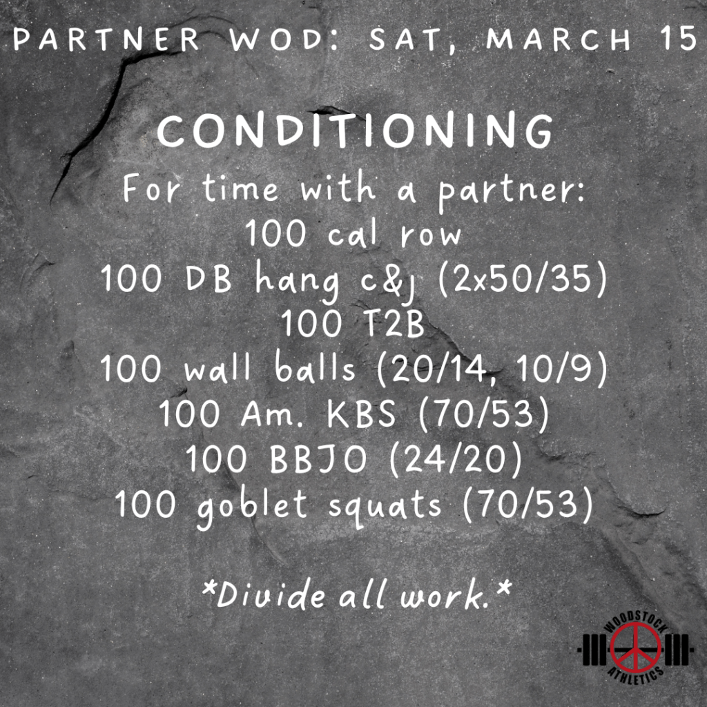 Partner WOD & Barbell Club: Sat, March 15 Posted bySteph VermeychukMarch 15, 2025March 9, 2025Posted inWorkout of the Day Share this: Click to share on X (Opens in new window) X Click to share on Facebook (Opens in new window) Facebook Like Loading... Related