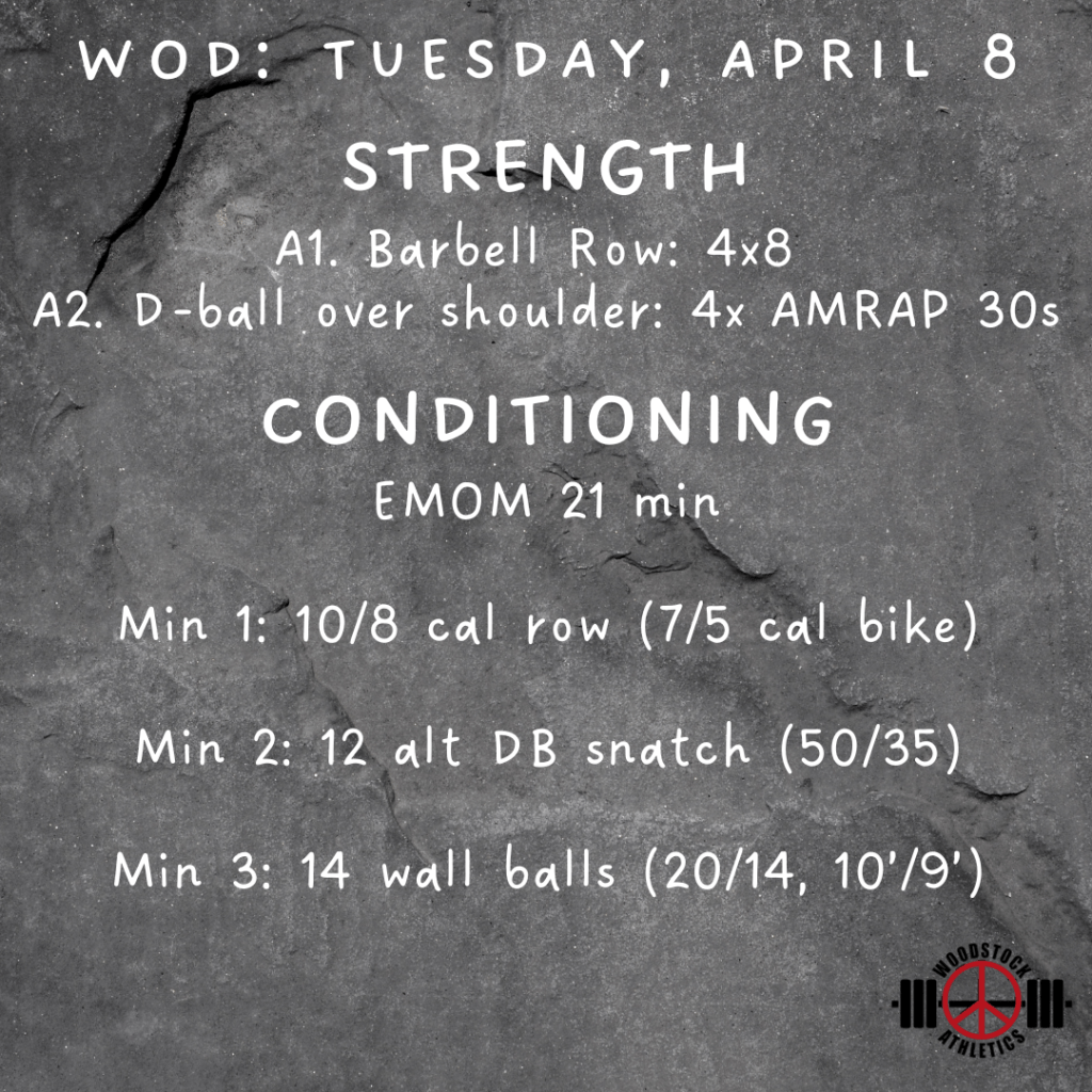 WOD & Barbell Club: Tuesday, April 8 Posted bySteph VermeychukApril 8, 2025April 6, 2025Posted inWorkout of the Day Share this: Click to share on X (Opens in new window) X Click to share on Facebook (Opens in new window) Facebook Like Loading... Related